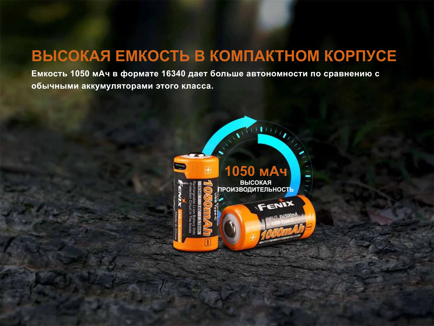 Модель Fenix ARB-L16-1050UP разработана специально для использования в современных компактных фонарях, требующих высокой токоотдачи и стабильного напряжения. Аккумулятор идеально подходит для налобных фонарей (HM50R V2.0) и компактных ручных моделей (PD25R, LD15R), а также совместим со всей линейкой устройств Fenix, рассчитанных на типоразмер 16340.
