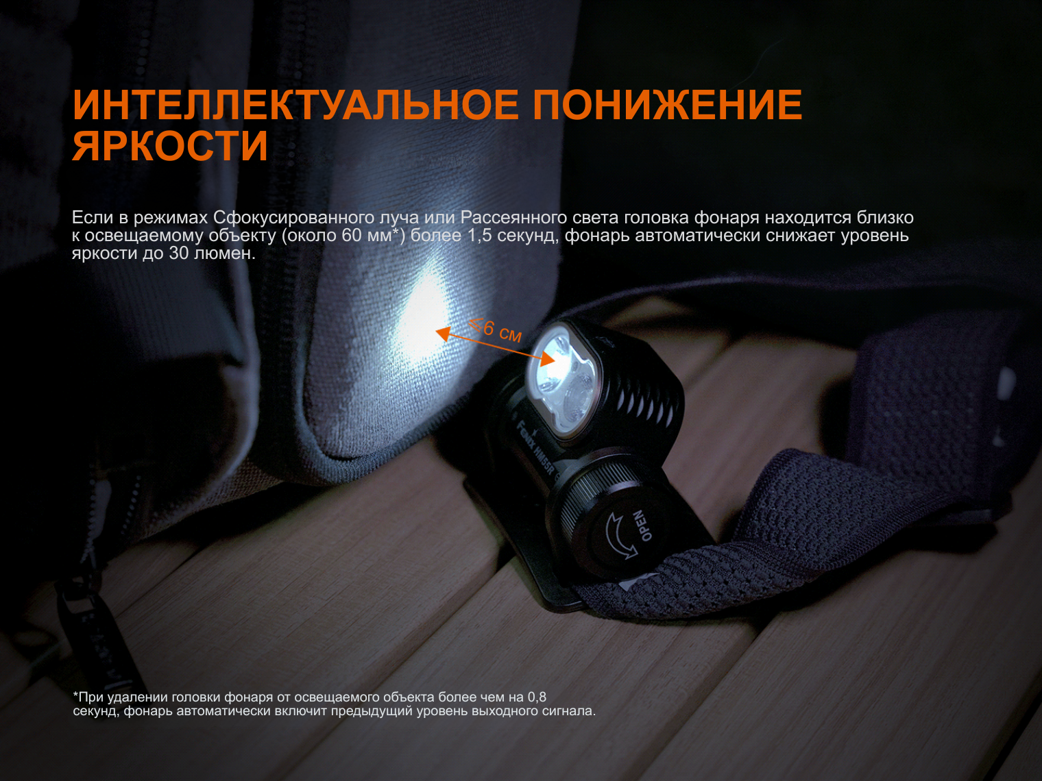 Функционал фонаря дополняет интеллектуальный датчик приближения. Он срабатывает в случае, если расстояние между головой модели и освещаемым объектом составляет ≤60 мм в течение 1.5 секунды. В таком случае яркость света автоматически снижается до 30 люмен, чтобы избежать возгорания предмета от нагревания под воздействием сверхмощного луча.