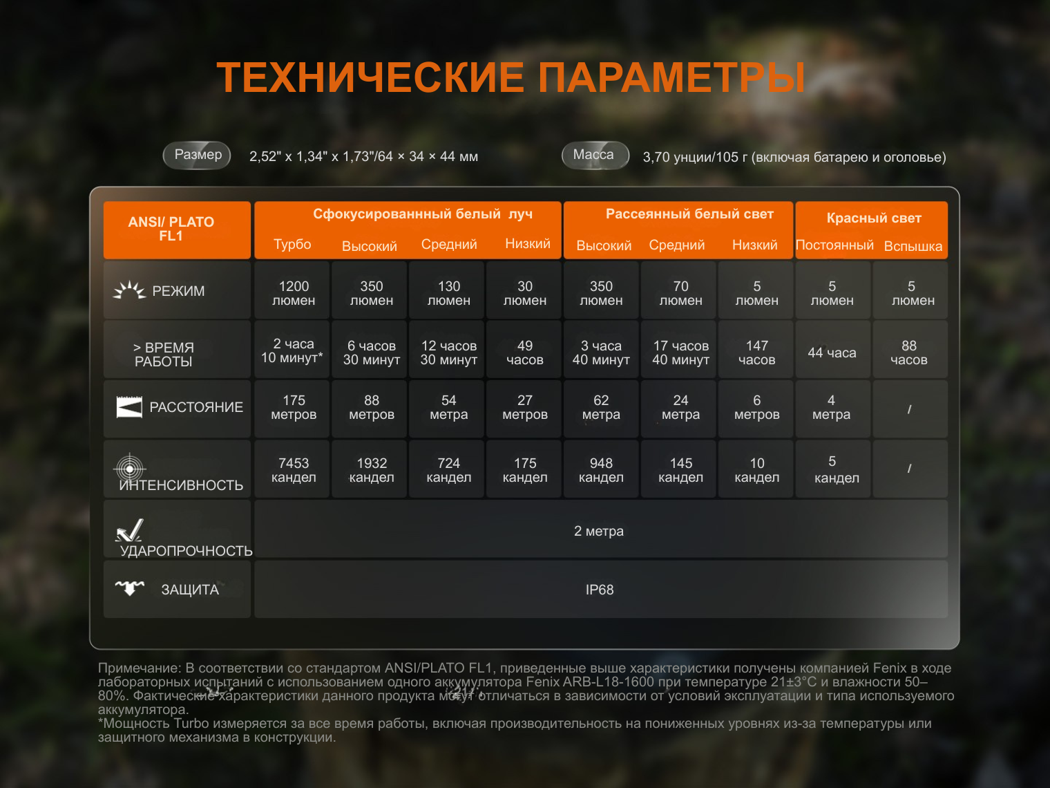 Обратите внимание! Защита от перегрева снижает яркость света в режиме Турбо, если температура электроники внутри достигает опасной отметки ~55°C. Время работы в режиме Турбо указано с учетом срабатывания защиты.