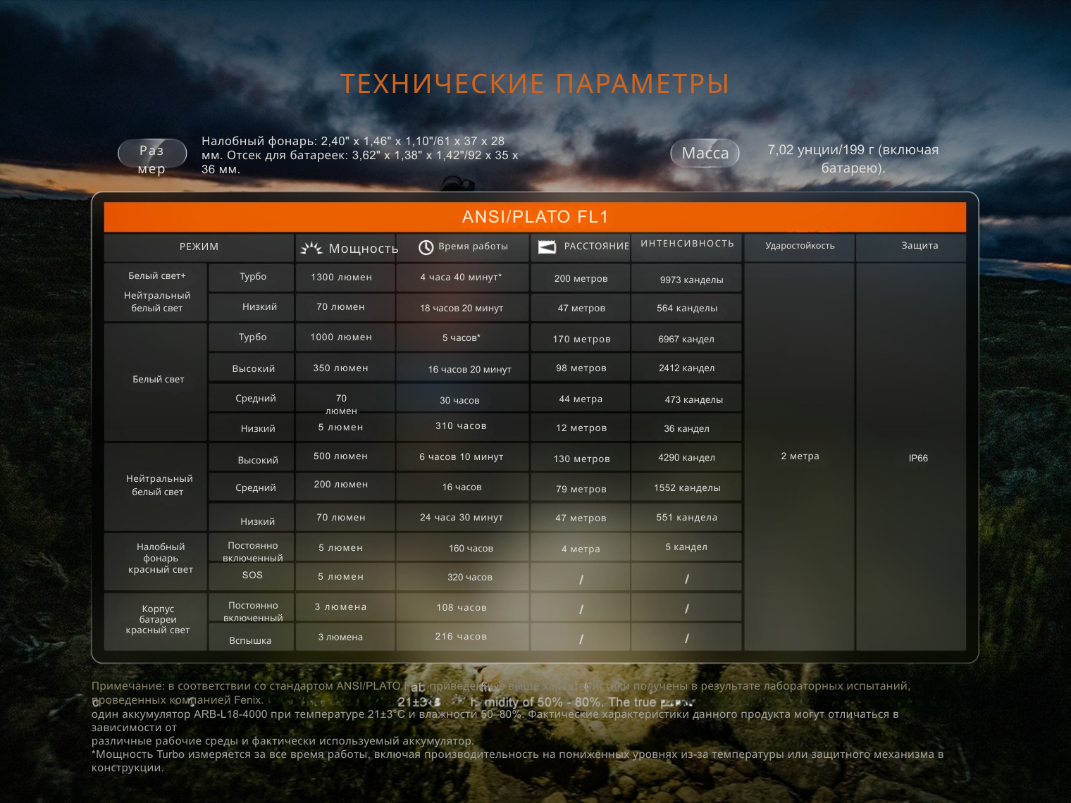 Обратите внимание! Время работы в режимах Турбо указаны как сумма времени работы в режимах меньшей яркости. Фонарь переключается на них, когда срабатывает защита от перегрева.