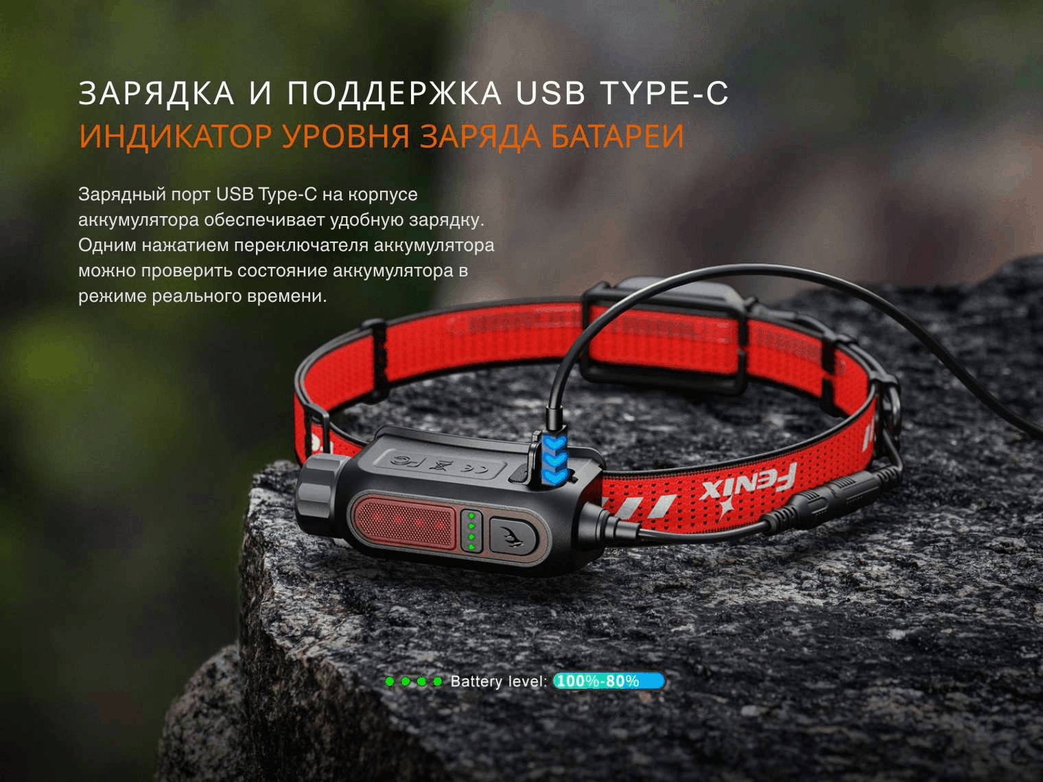 Главная особенность Fenix HP12R-T — батарейный блок, вынесенный на заднюю часть налобного крепления. Такое решение позволяет сбалансировать вес между корпусом фонаря и батарейным отсеком, предотвращая скольжение конструкции на голове во время активного движения.