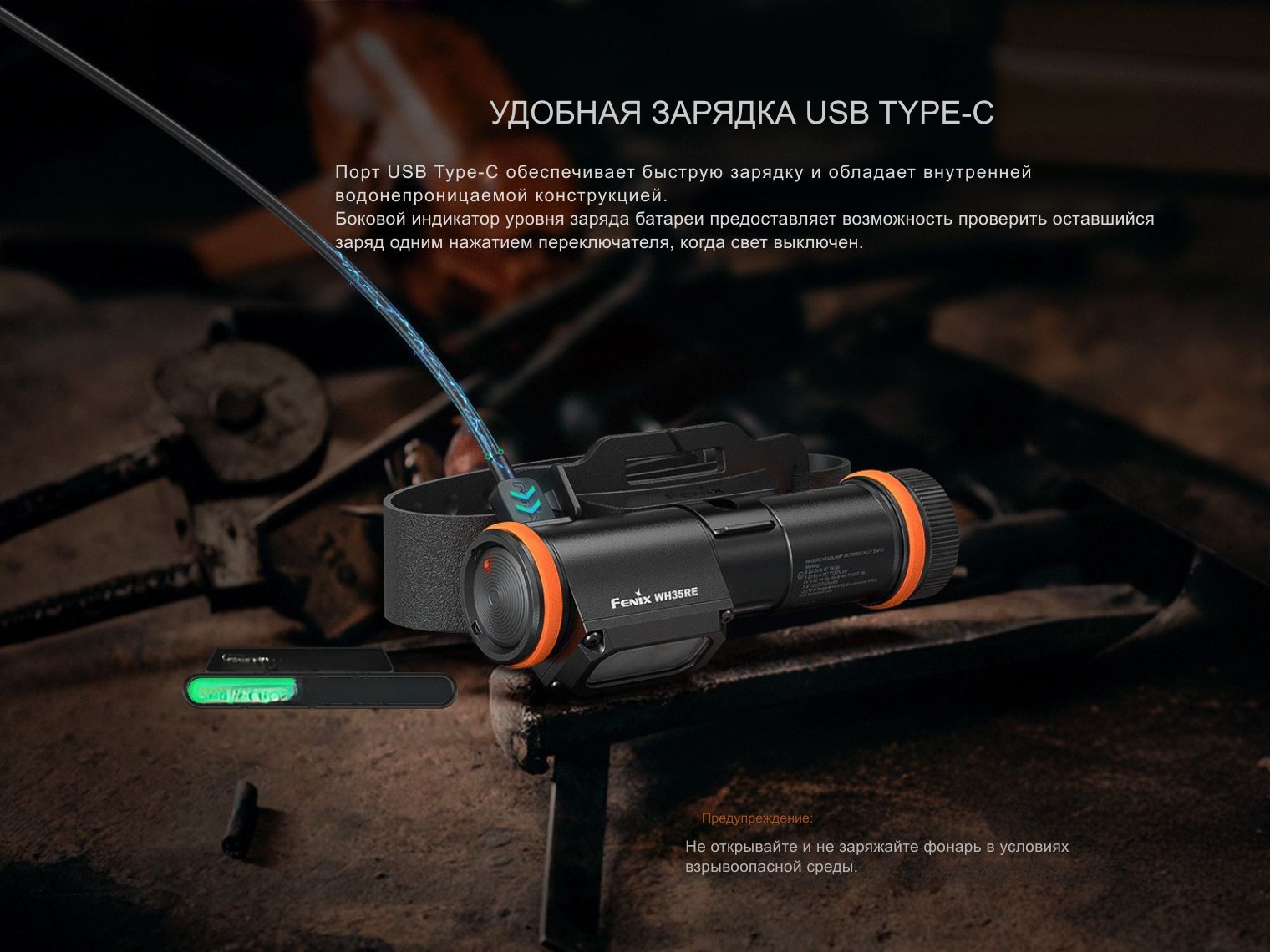 WH35RE питается от специального взрывозащищенного Li-ion аккумулятора Fenix ARB-L21-3000Ex форм-фактора 21700 (3000 мАч) из комплекта. Зарядка осуществляется через порт USB-C с внутренней влагозащитой. Для соблюдения требований безопасности при зарядке необходимо использовать комплектный адаптер.