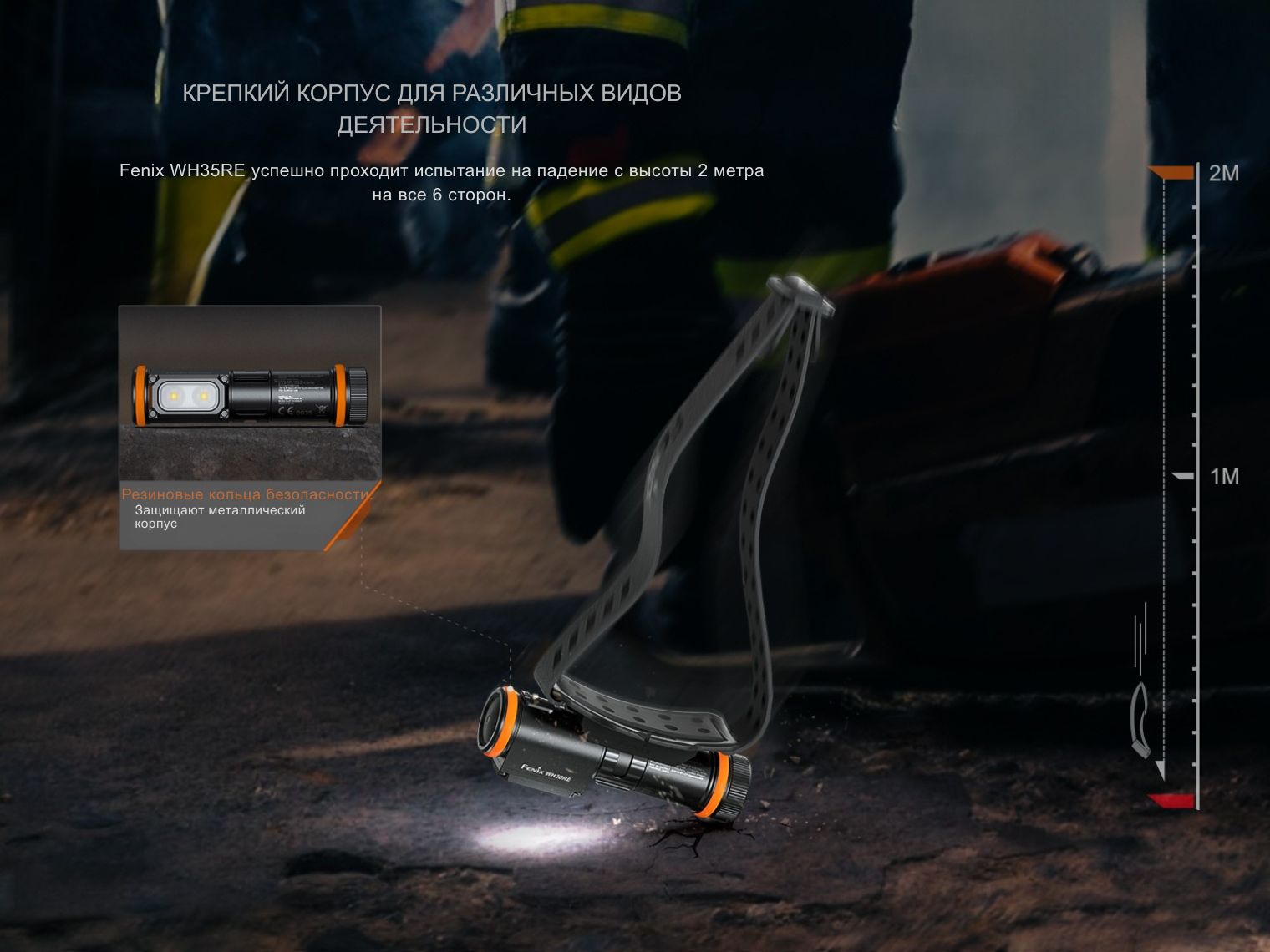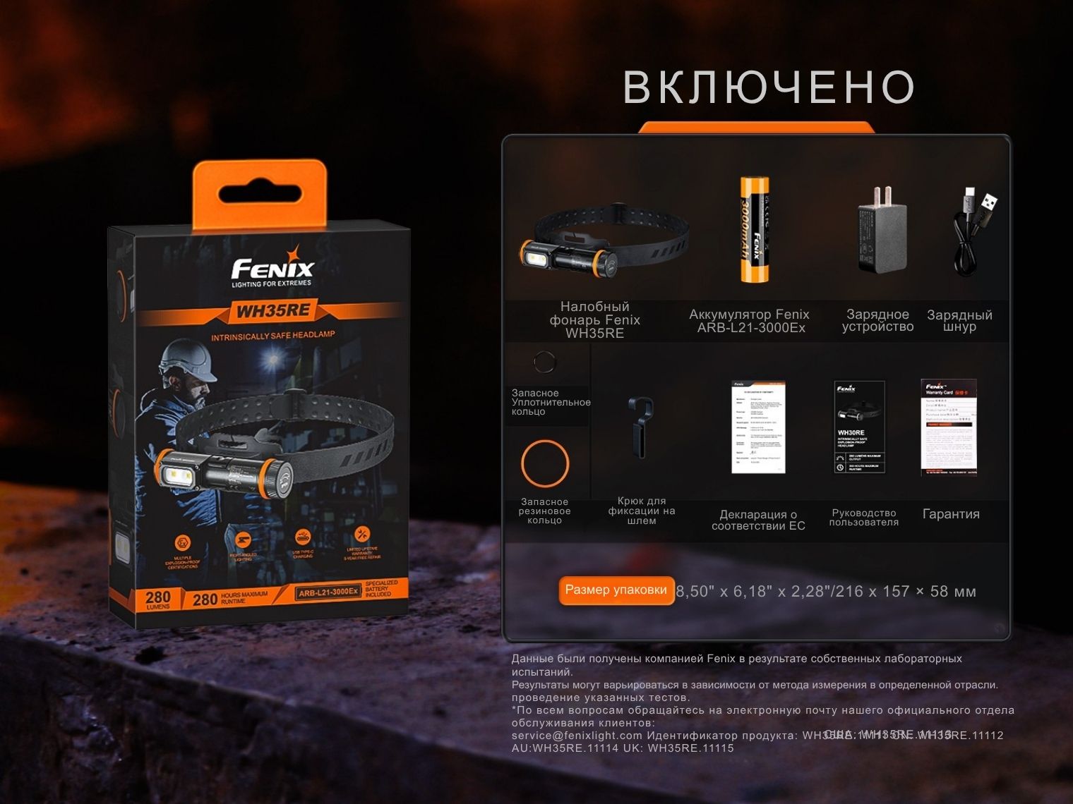 Комплектация | Fenix WH35RE, аккумулятор ARB-L21-3000Ex (21700), зарядный USB-C кабель, адаптер для зарядки, антистатическое оголовье с креплением, запасные уплотнительные кольца, инструкция |