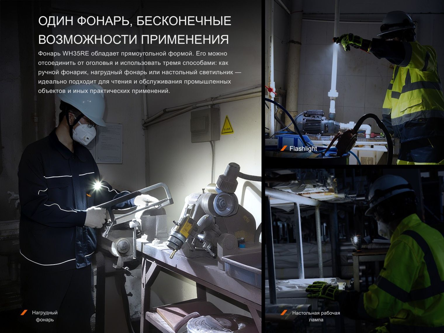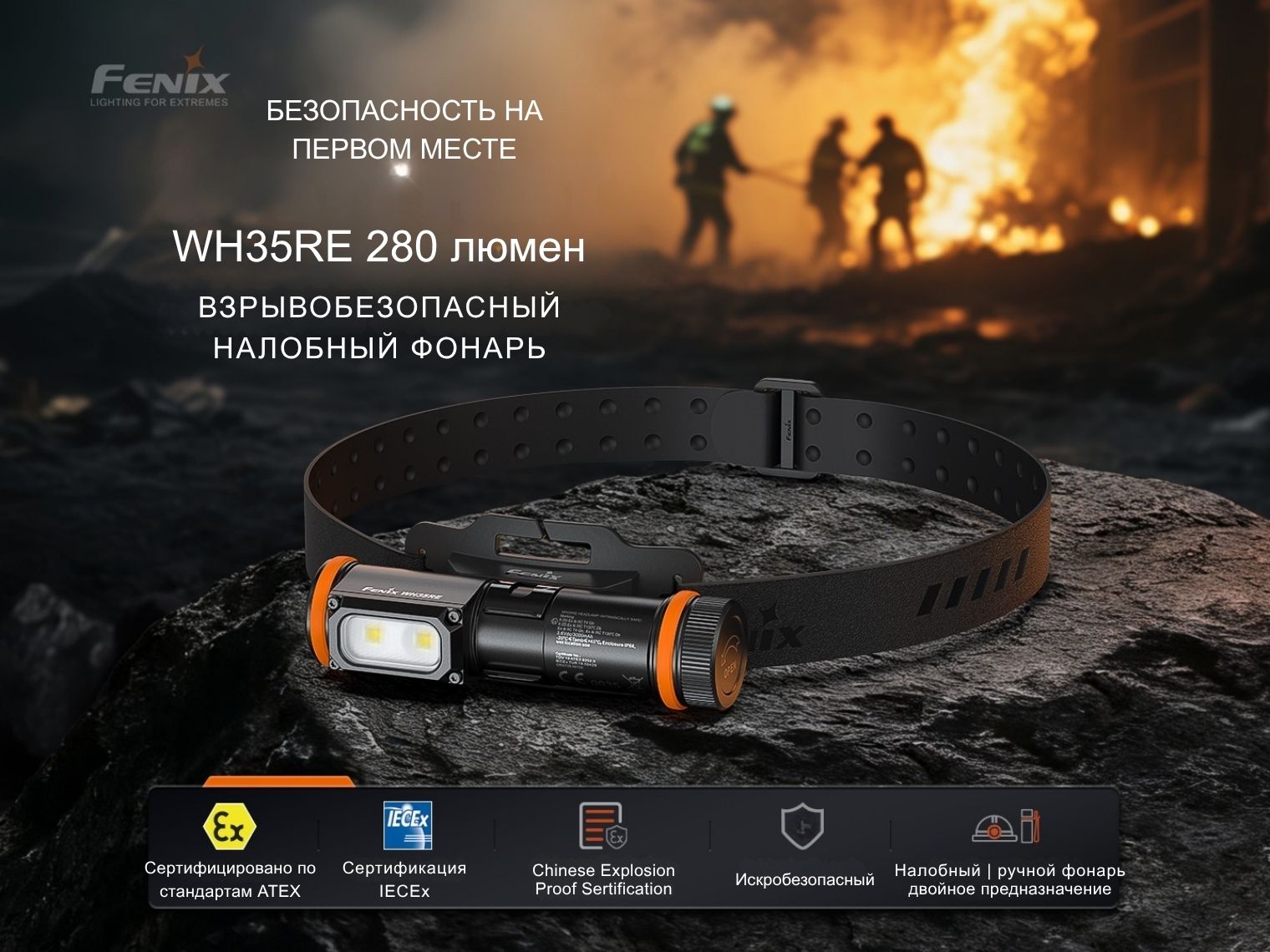 Налобный фонарь Fenix WH35RE со взрывозащищенной конструкцией предназначен для работы в зонах с риском взрыва газов и пылевоздушных смесей на объектах нефтехимии, энергетики, металлургии, целлюлозно-бумажной и текстильной промышленности. Модель сертифицирована по стандартам IECEx, ATEX и GRGT.