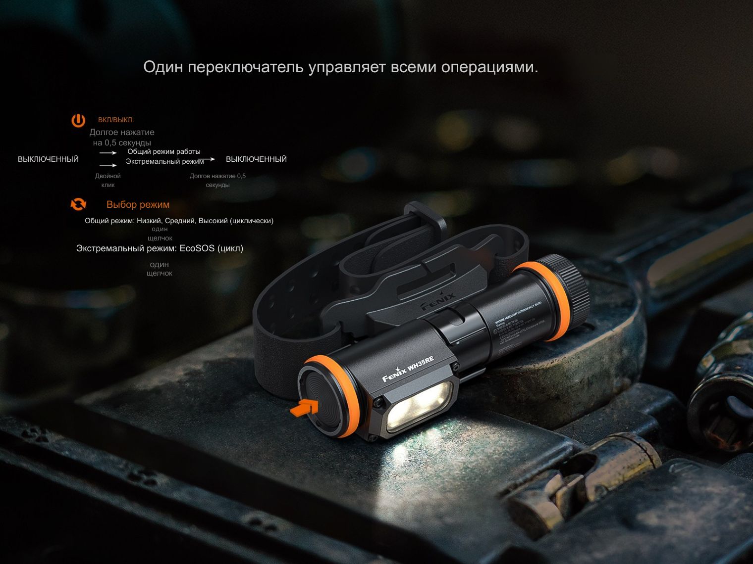 Обратите внимание! В фонаре Fenix WH35RE есть защита от перегрева. Время работы в режиме Высокий рассчитана в сумме со временем работы на более низкой мощности, на которую система переключается автоматически при чрезмерном нагревании электроники.
