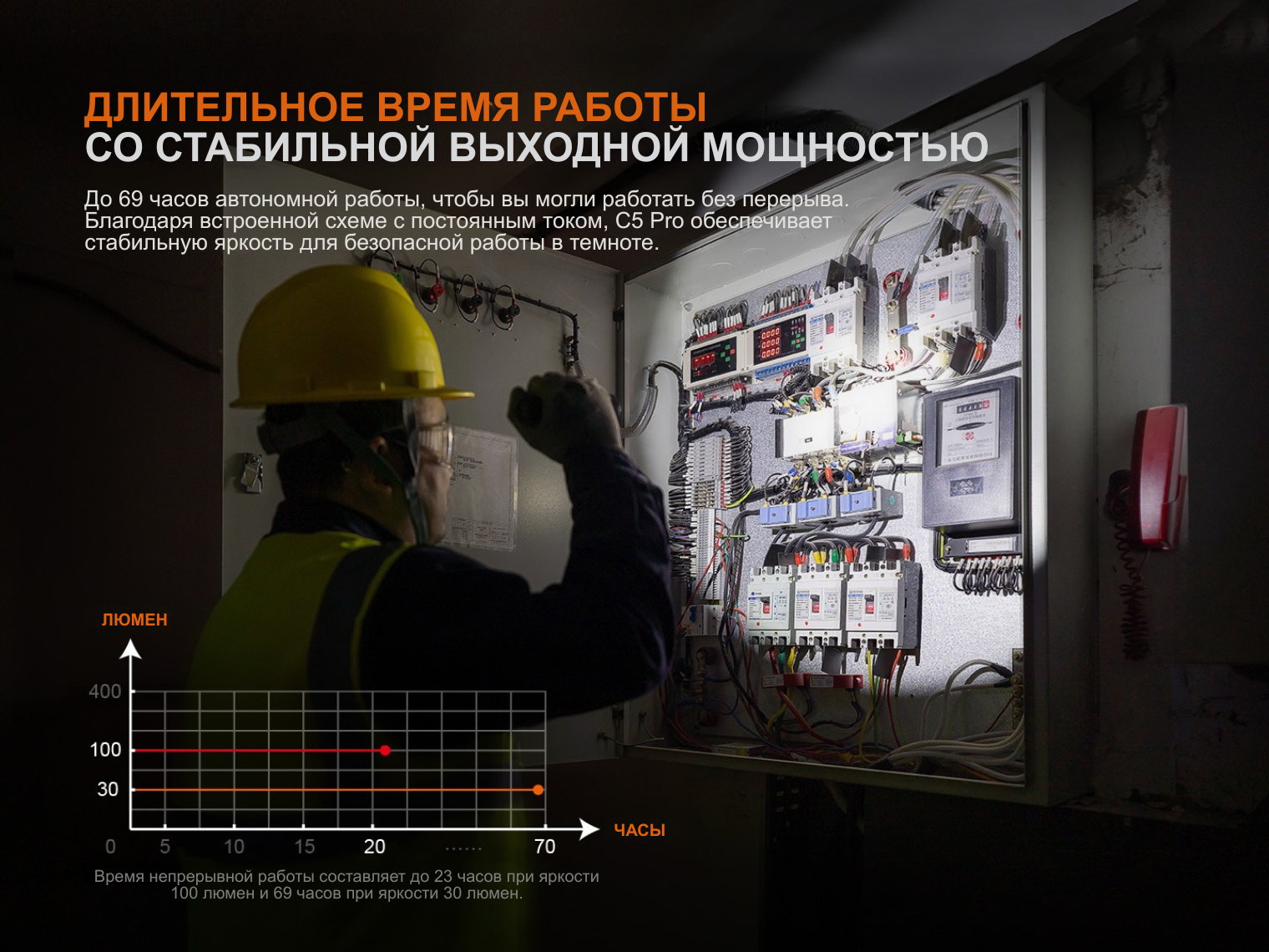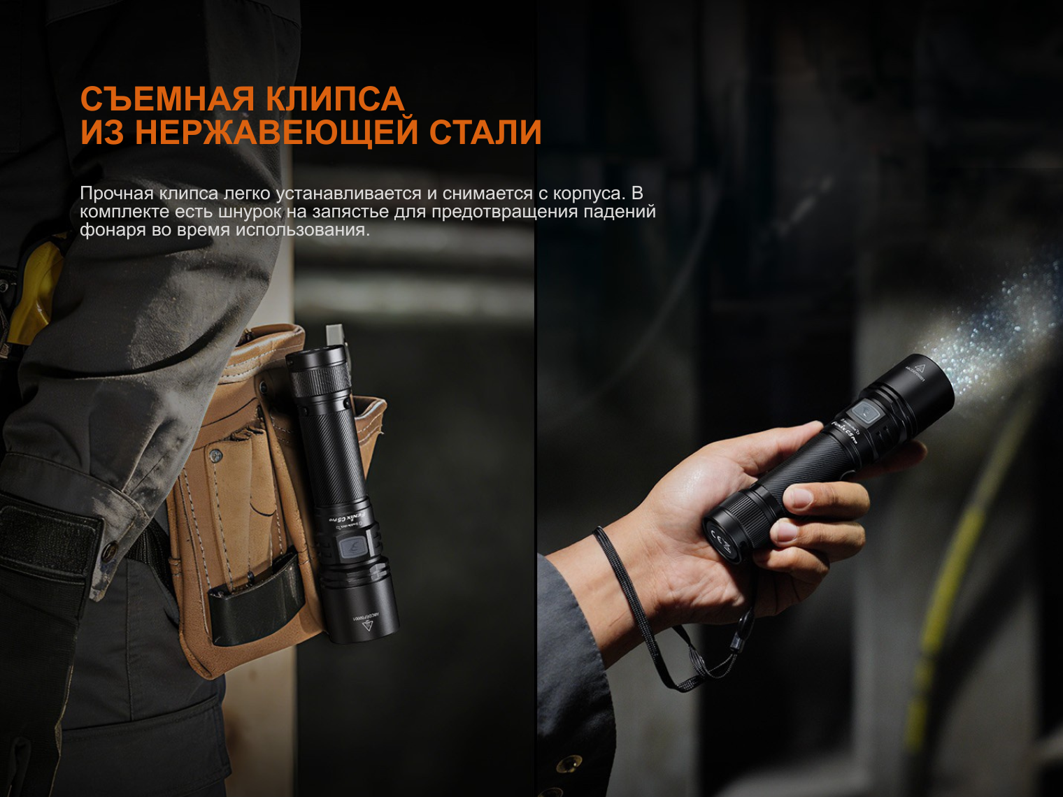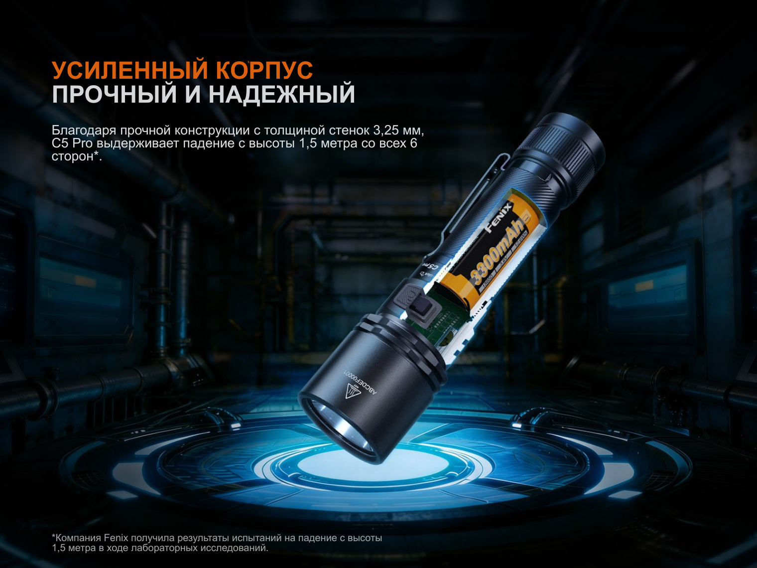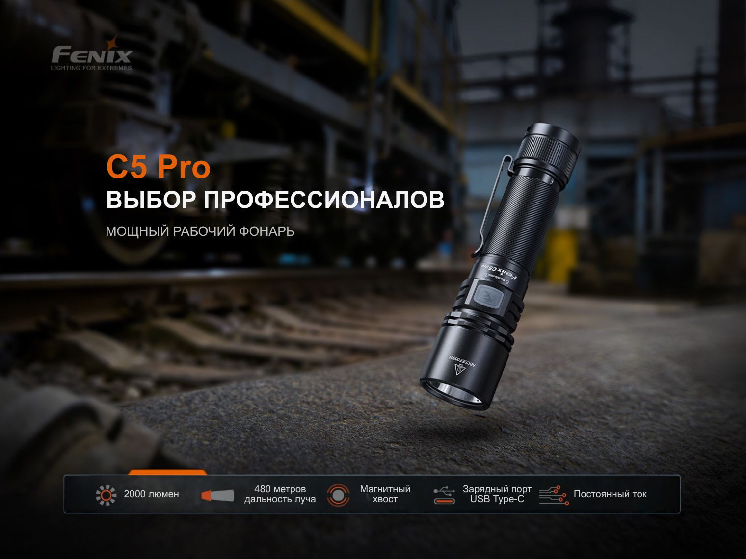 Fenix C5 Pro — это профессиональный инструмент, разработанный для задач, требующих экстремальной дальности луча и максимальной выносливости. Он сочетает мощность большого поискового фонаря с удобством карманной модели, поэтому идеален для патрулирования, охраны или суровых индустриальных будней.