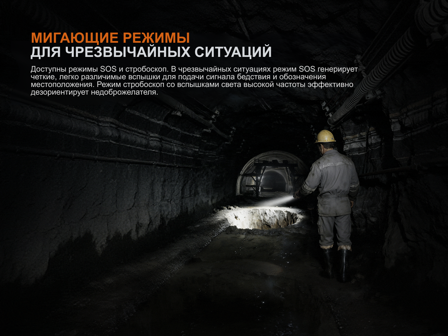 В модели установлен светодиод Luminus SFT40 Gen2 с ресурсом работы 50 000 ч. Благодаря узконаправленной оптике фонарь формирует концентрированный луч, достигающий отметки 480 метров. Это обеспечивает четкую видимость удаленных объектов при сохранении достаточной боковой засветки.