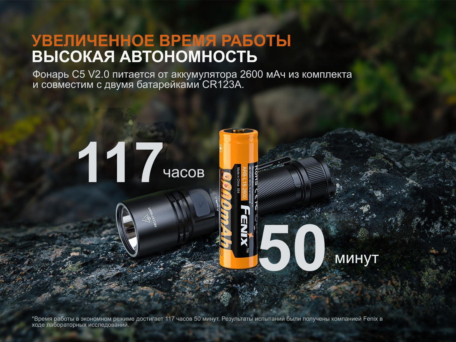 Fenix C5 V2.0 питается от одного Li-ion аккумулятора формата 18650 емкостью 2600 мАч (ARB-L18-2600 в комплекте). Также фонарь совместим с двумя литиевыми батарейками CR123A, что важно для работы при критически низких температурах. Зарядка осуществляется через интегрированный порт USB Type-C под защитной заглушкой.
