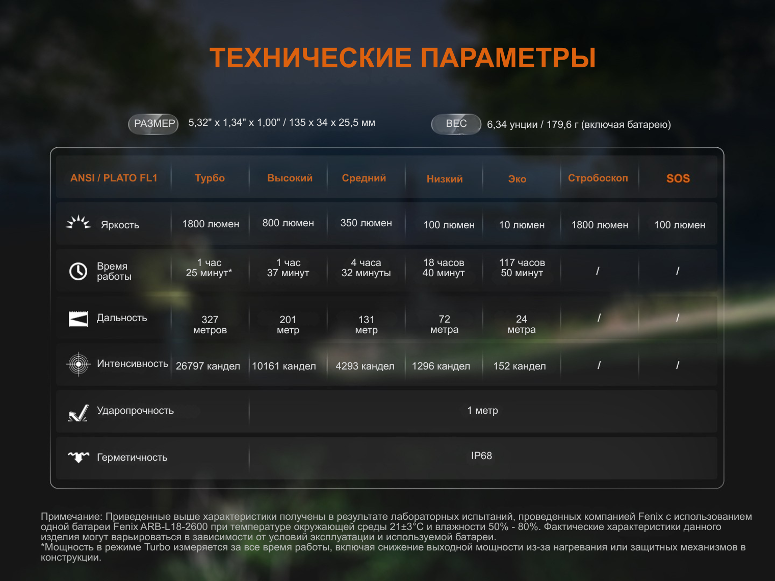 Обратите внимание! Время работы в режиме Турбо указано суммарно, учитывая снижение яркости при срабатывании системы защиты от перегрева.