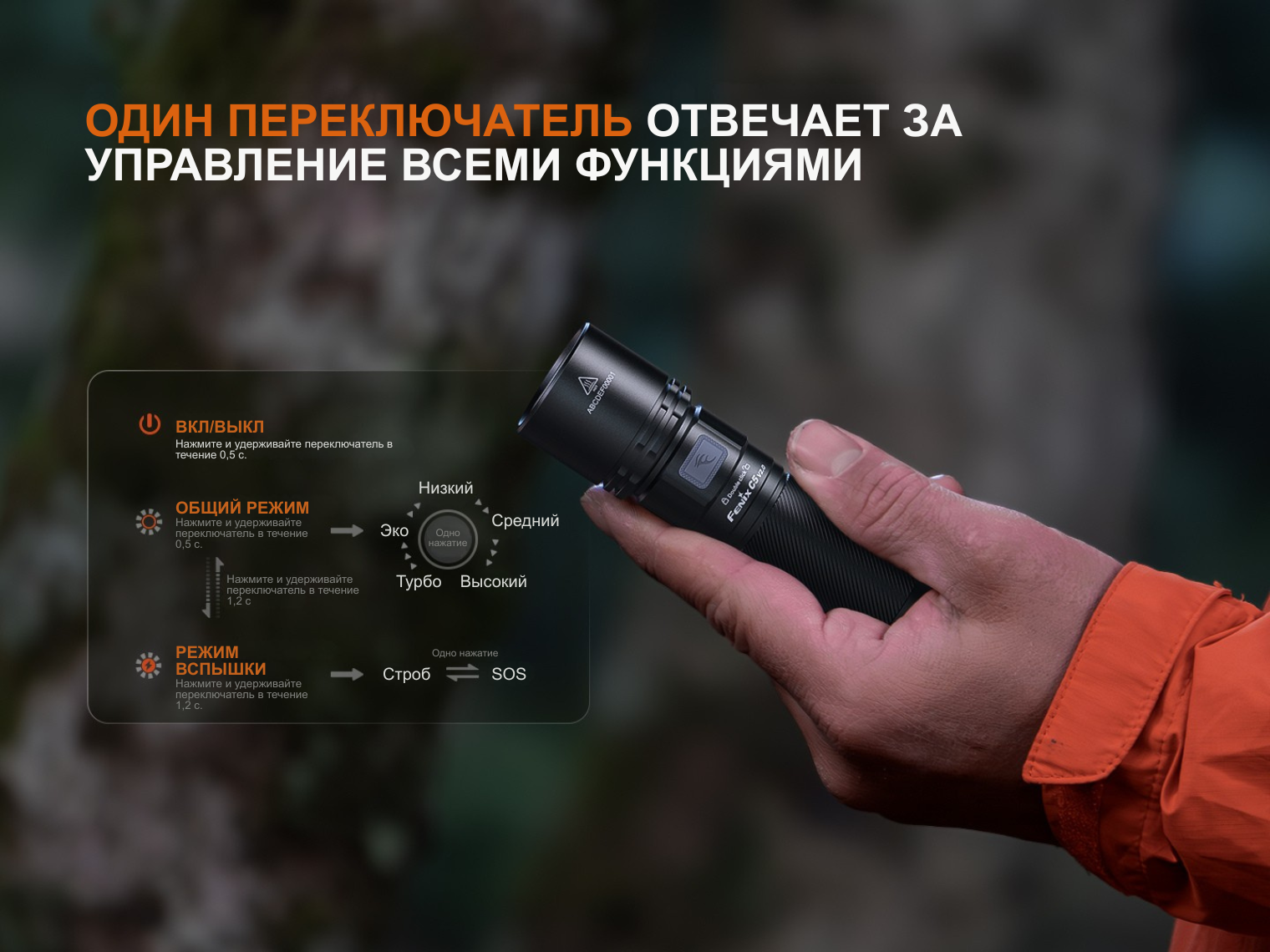 Все функции управляются единственной металлической кнопкой в головной части фонаря. Она отвечает за включение (зажатие на 0.5 с), выбор яркости короткими кликами и активацию режимов Стробоскоп/SOS (зажатие на 1.2 с).