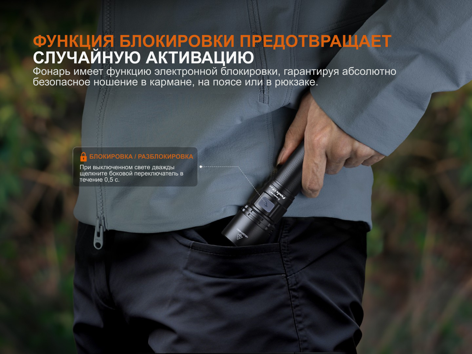 Такой подход позволяет мгновенно настроить свет под ситуацию одним пальцем. Эта же кнопка отвечает за блокировку фонаря двойным нажатием и проверку уровня заряда через встроенный индикатор.
