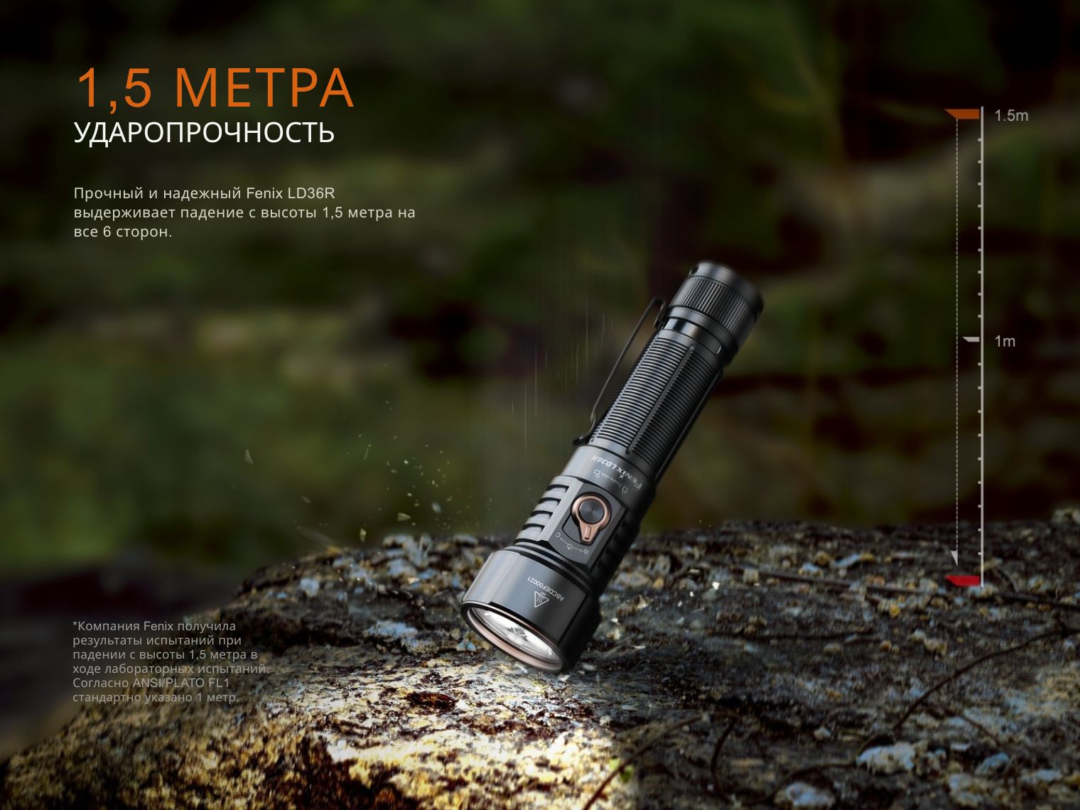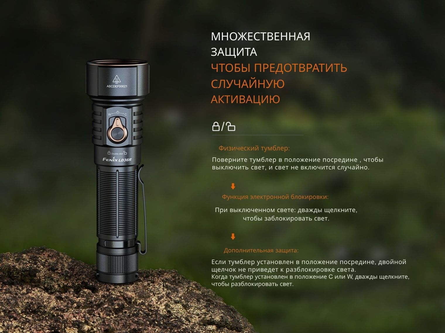Комплектация | Fenix LD36R, аккумулятор ARB-L21-6000, зарядный кабель USB-С, диффузионный фильтр AOD-04, запасное уплотнительное кольцо, чехол, темляк, инструкция |