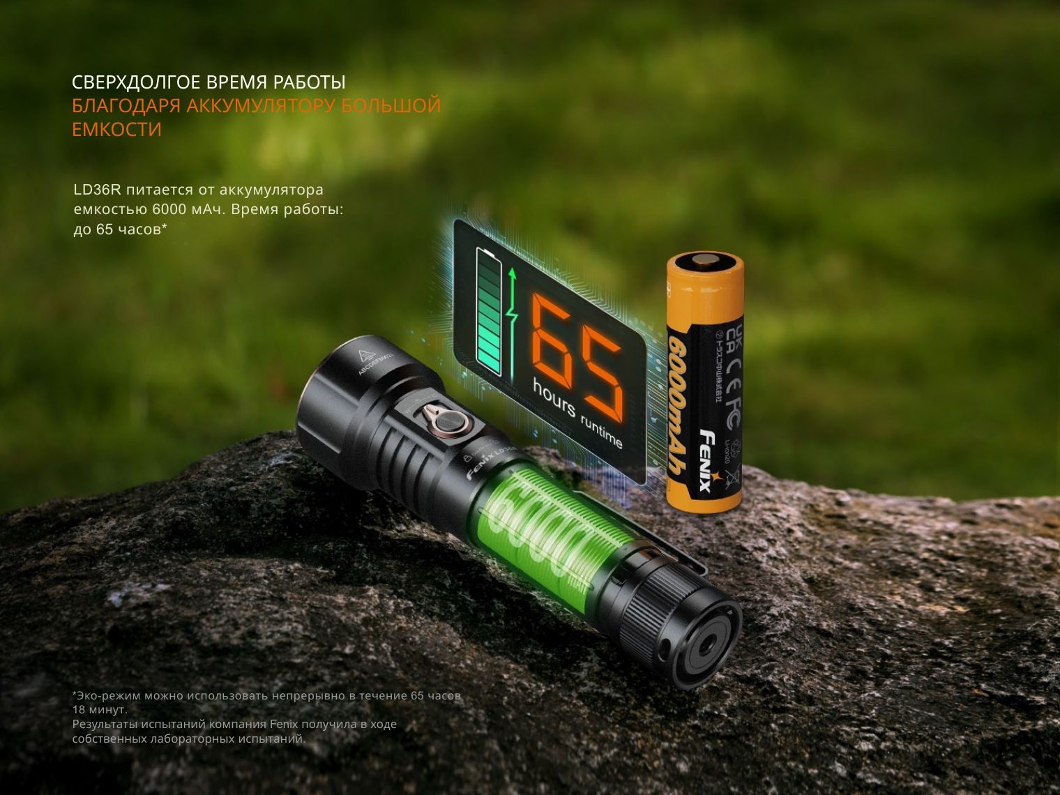 Fenix LD36R питается от сверхъемкого фирменного аккумулятора Fenix на 6000 мАч (есть в комплекте). Интеллектуальная защита исключает поломку электроники при установке батареи неправильной стороной.