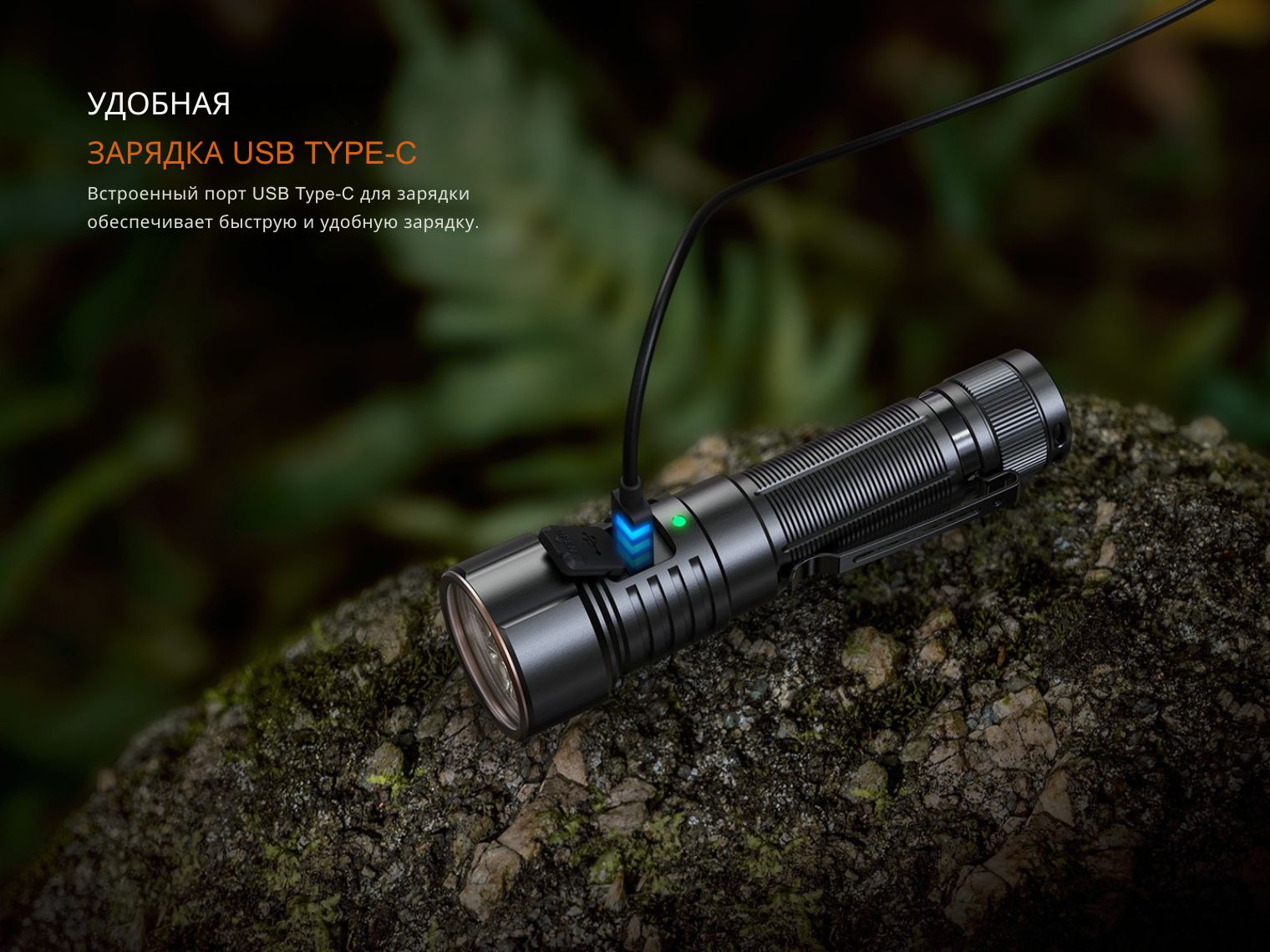 Аккумулятор заряжается через влагозащищенный порт USB-C в голове фонаря. Время зарядки составляет 3.5 ч при использовании зарядного адаптера 5 В/2.5 А.
