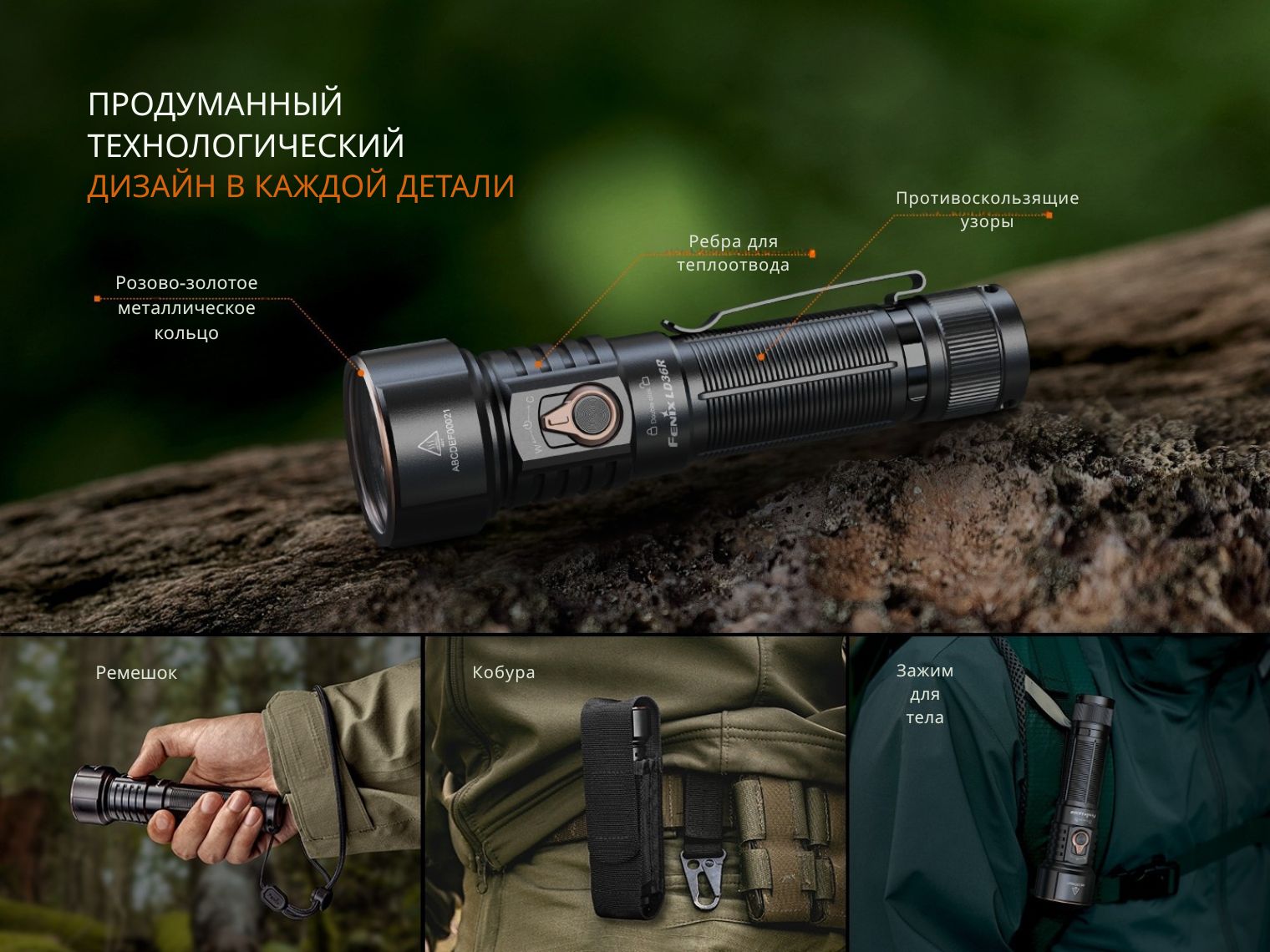 Fenix LD36R комплектуется съемной клипсой для фиксации на сумке или кармане. В хвосте есть резьба 1/4" для крепления фонаря на штативе.