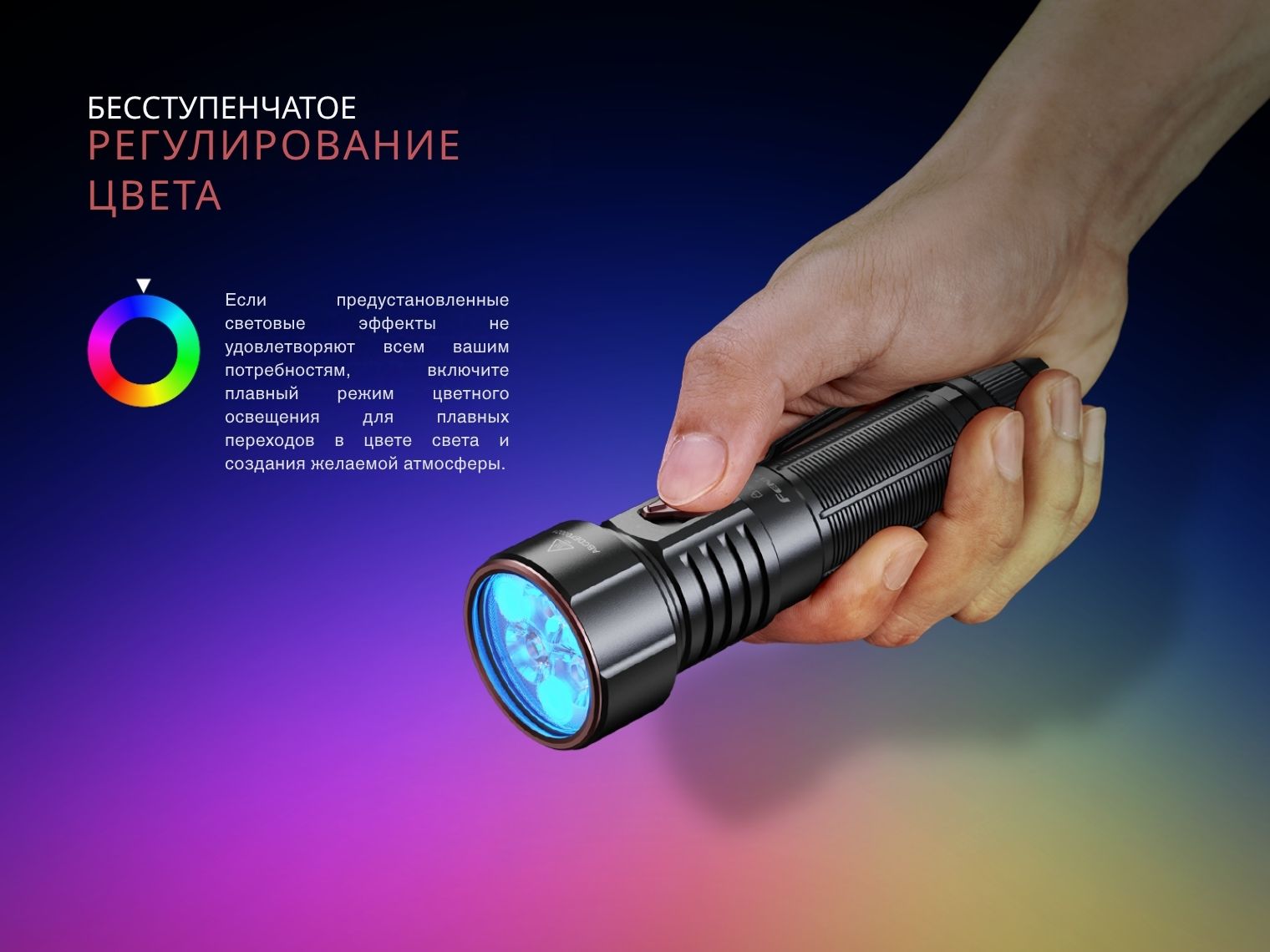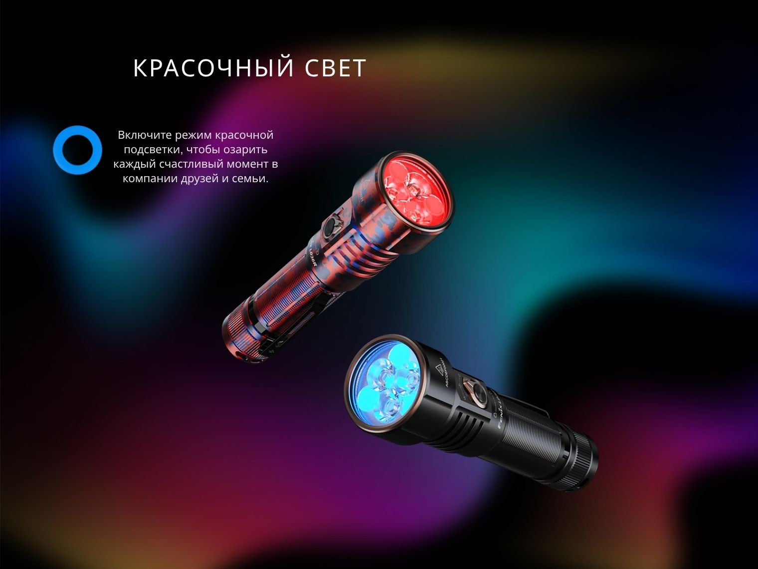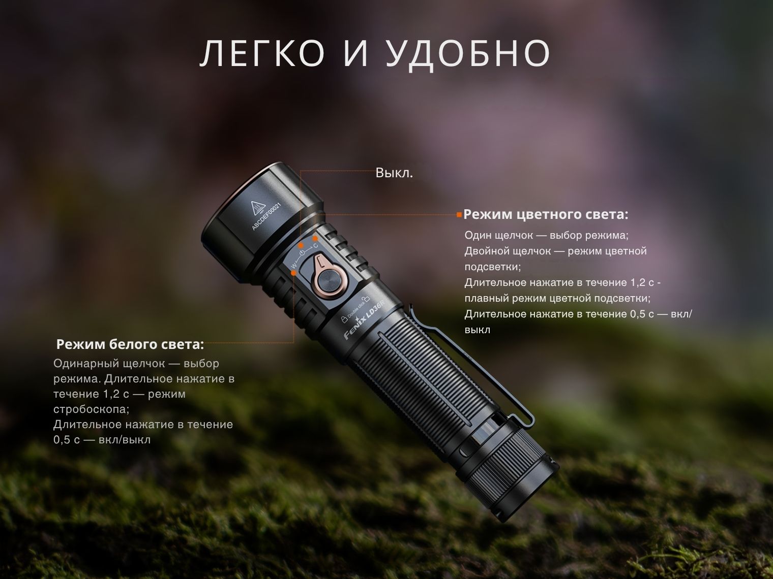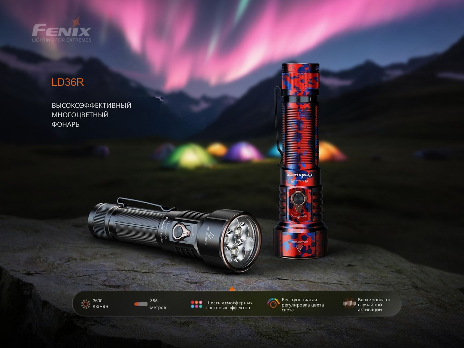 Многоцелевой фонарь Fenix LD36R выполняет функции ручного источника освещения и цветного прожектора, что делает его идеальным выбором не только для повседневного использования и туризма, но и для фото- и видеосъемок.