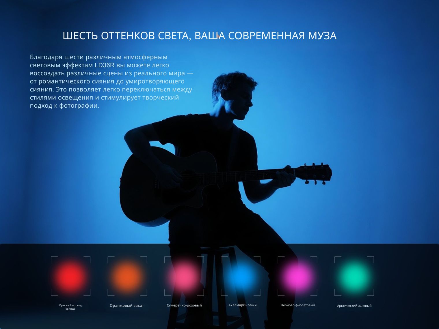 Цветные диоды излучают свет в 6 разных оттенках, позволяя настраивать освещение под текущее настроение и требования для создания контента. Срок службы каждого светодиода составляет 50000 ч.