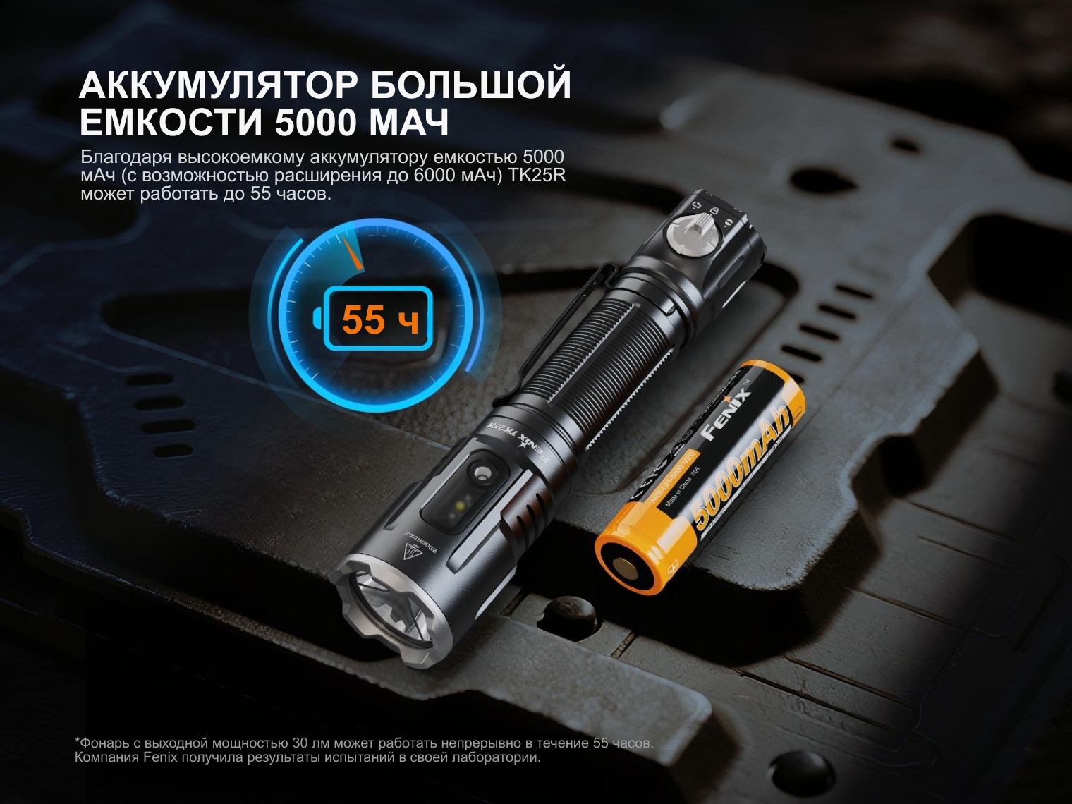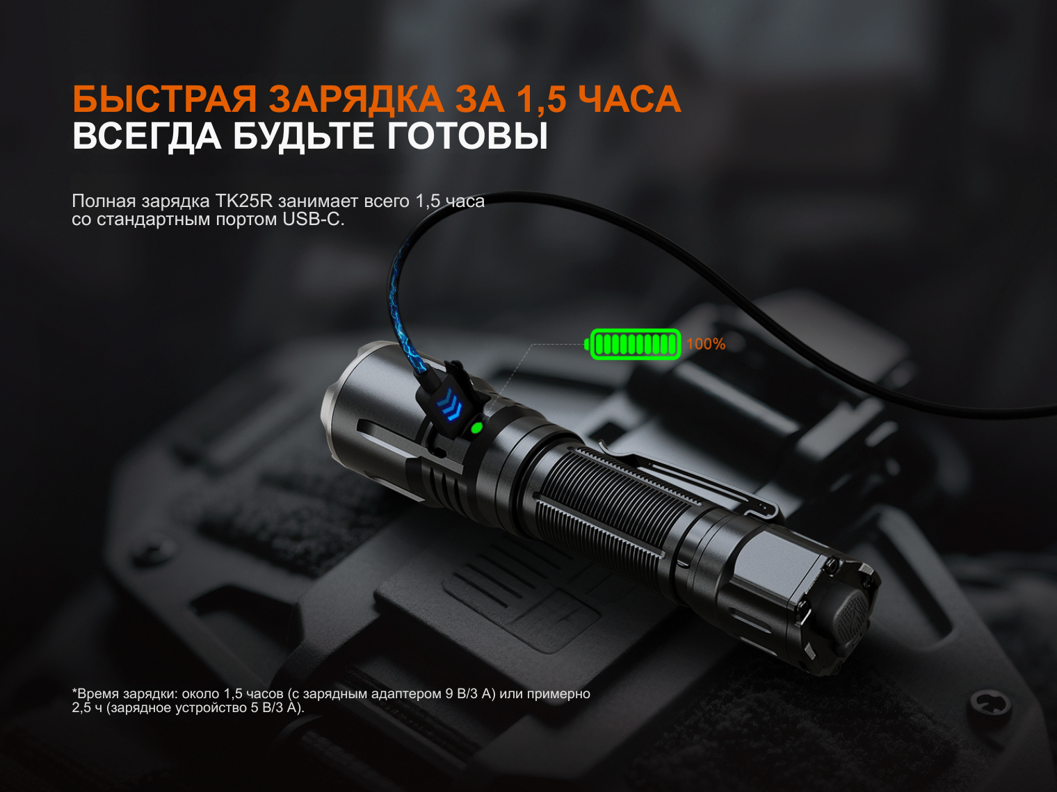 Fenix TK25R работает от Li-ion аккумулятора 21700 емкостью 5000 мАч (ARB-L21-5000 V2.0 в комплекте). Рабочее напряжение составляет 3.0–4.2 В. Зарядка осуществляется через встроенный порт USB-C с внутренней защитой от воды, который поддерживает быструю зарядку (3А) — полный цикл занимает всего 1.5 часа.
