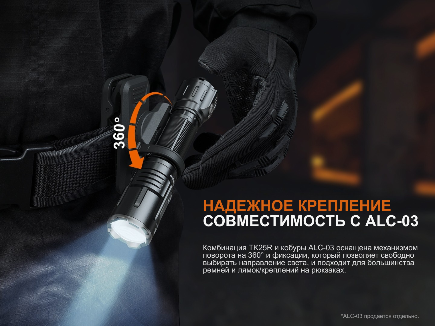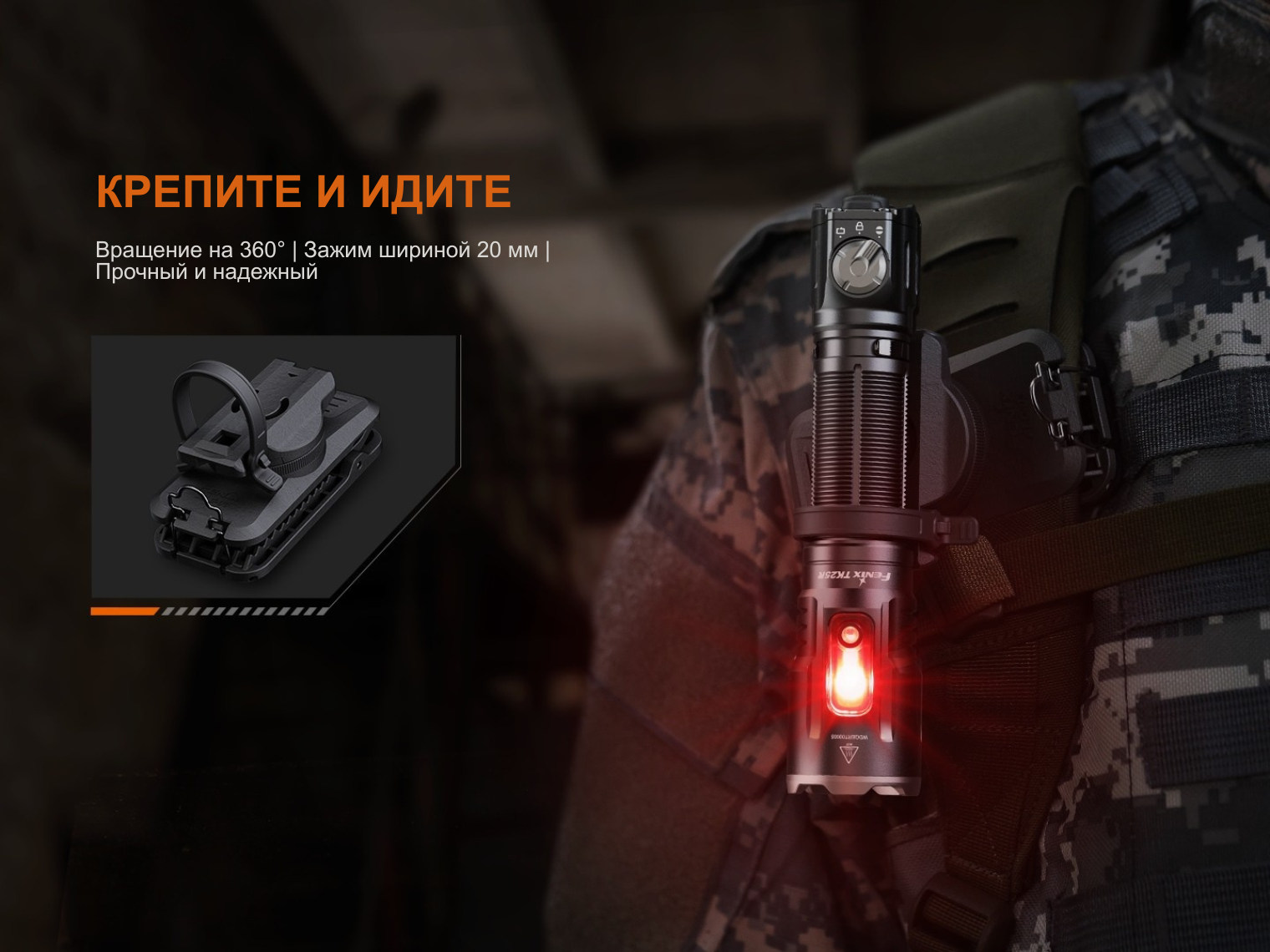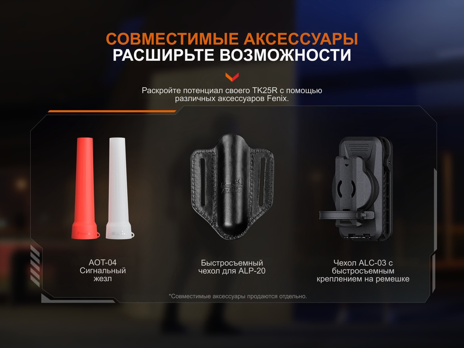 Fenix TK25R совместим с тактическими аксессуарами: выносными кнопками (например, серии AER), креплениями на оружие серии ALG и светофильтрами соответствующего диаметра. В комплекте предусмотрена съемная стальная клипса для надежной фиксации на одежде или снаряжении.