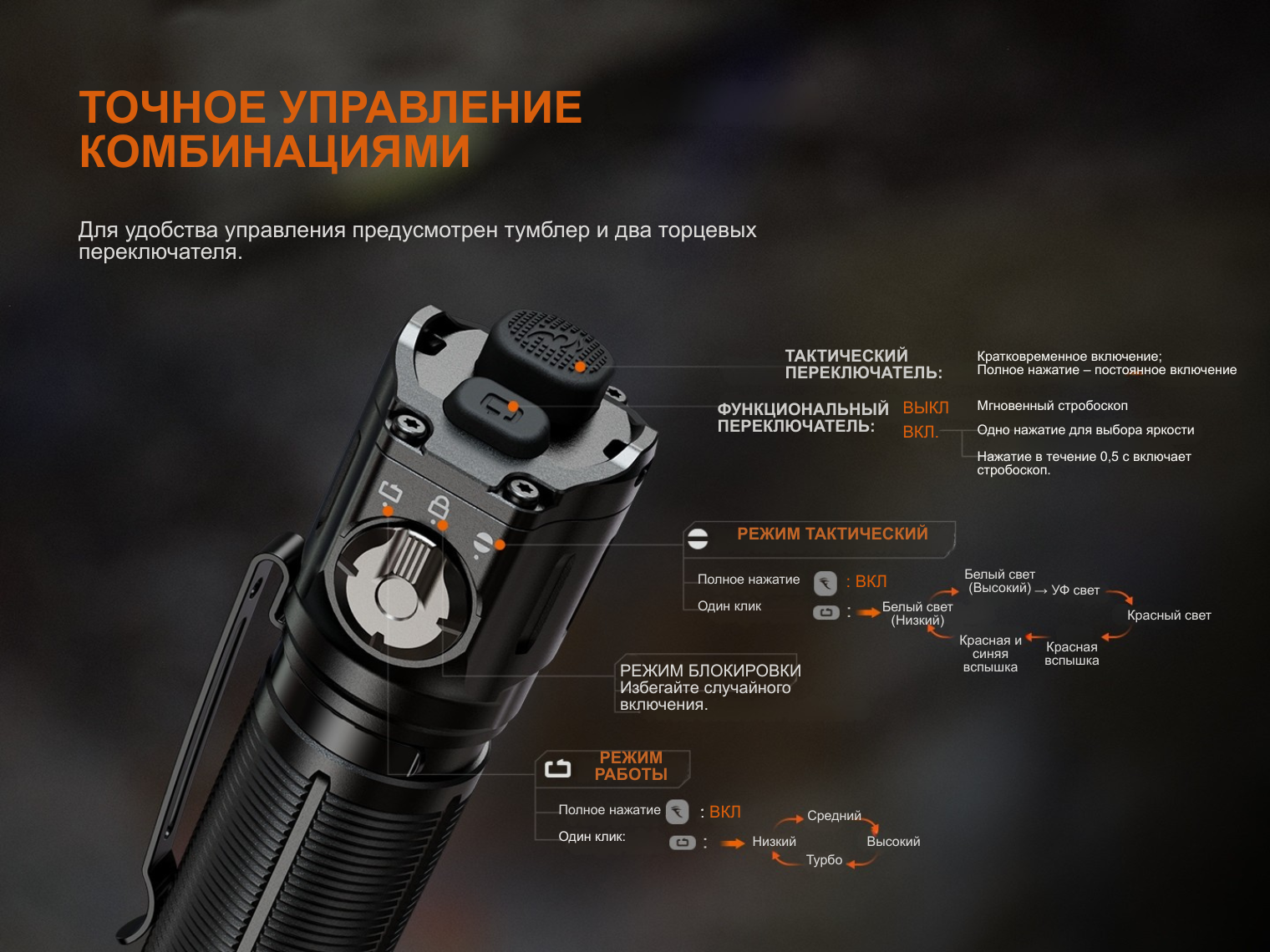 Обратите внимание! Указанное время работы в режиме Турбо измерено с учетом времени свечения на режимах с меньшей яркостью. Мощность снижается автоматически при чрезмерном нагреве электроники.