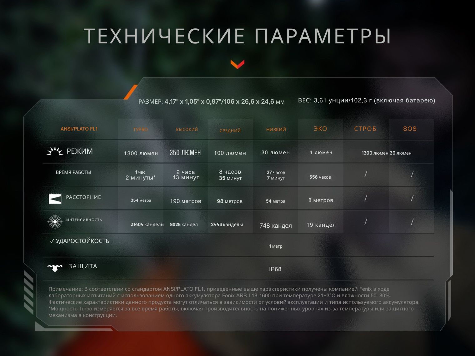 В основе оптики находится светодиод Luminus SFT25R с цветовой температурой ~6500K и закаленная ультрапрозрачная линза с просветляющим покрытием для стабильного, сфокусированного светового рисунка. Яркость света достигает 1300 люмен с дальностью 354 м, что достаточно и для городских задач, и работы на открытой местности.