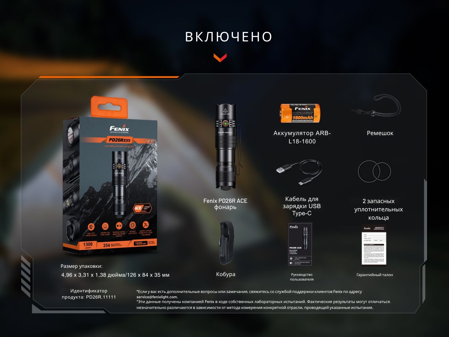 Фонарь Fenix PD26R ACE, аккумулятор 18350 на 1600 мАч (ARB-L18-1600), кабель USB Type-C, чехол, темляк, 2 запасных уплотнительных кольца, инструкция пользователя, гарантийный талон.