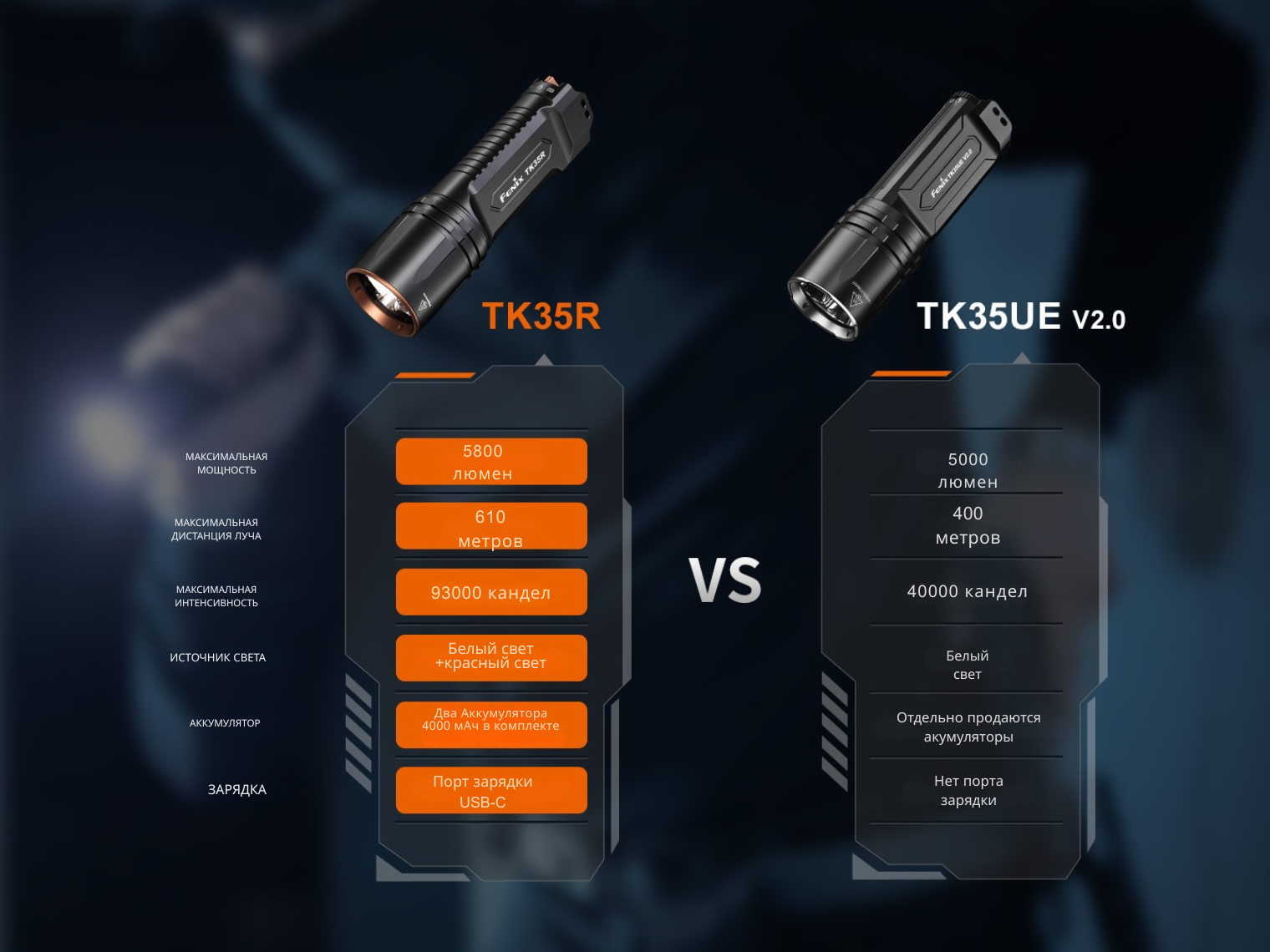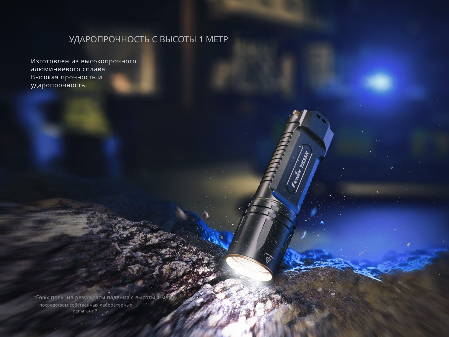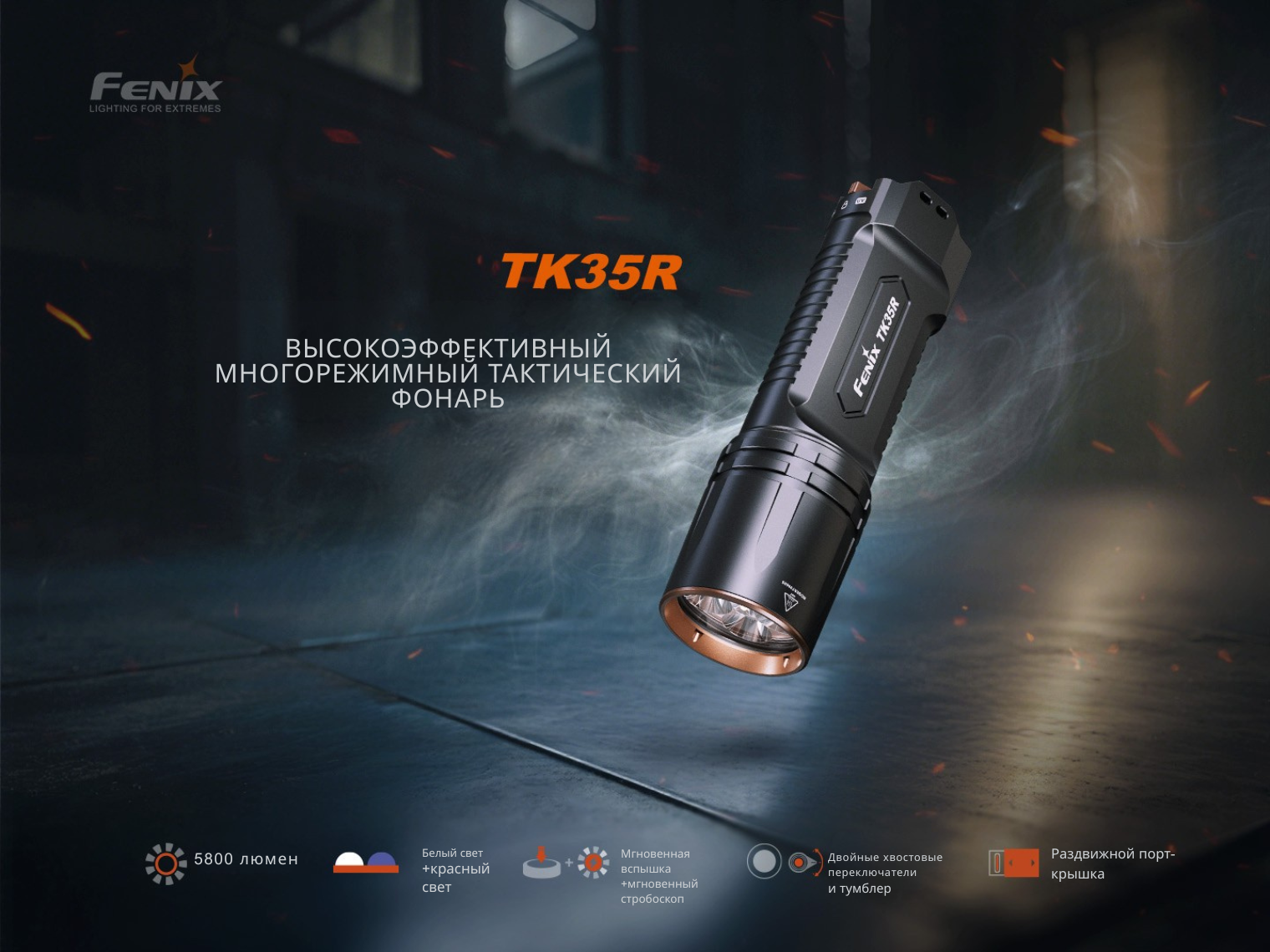 Фонарь Fenix TK35R — тактическая модель для профессионального применения во время патрулирования, поисково-спасательный целей и сложных миссий на открытом воздухе, когда необходим функциональный, яркий и особо прочный источник света.