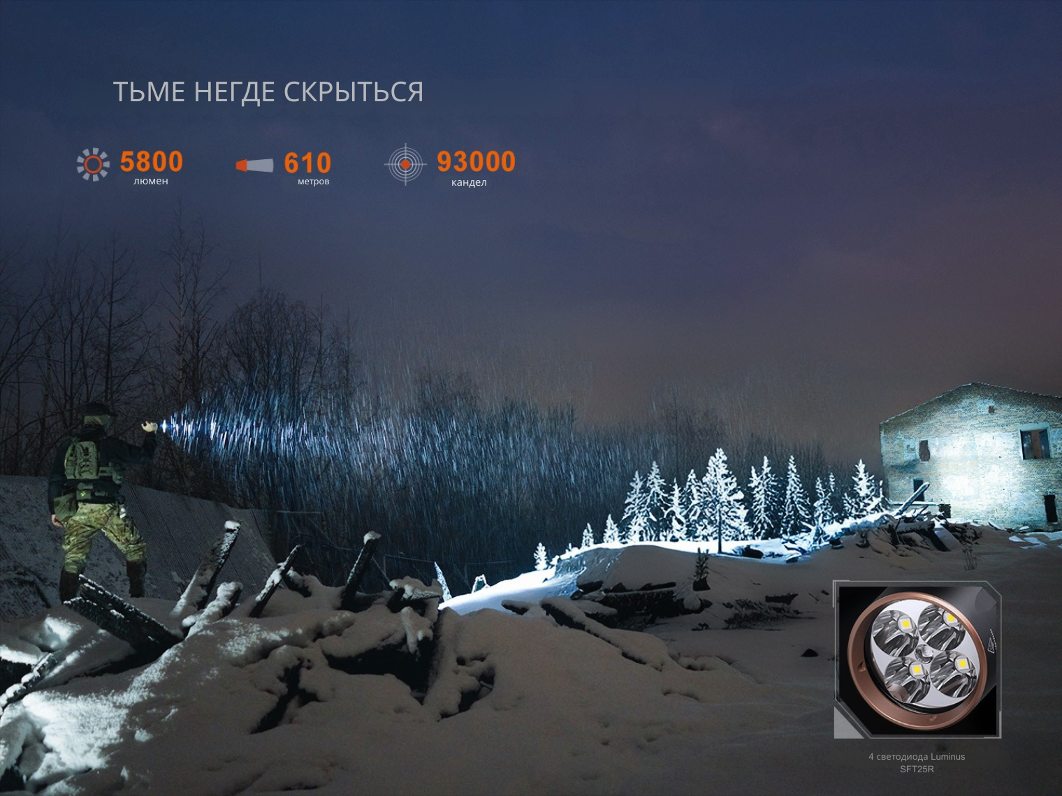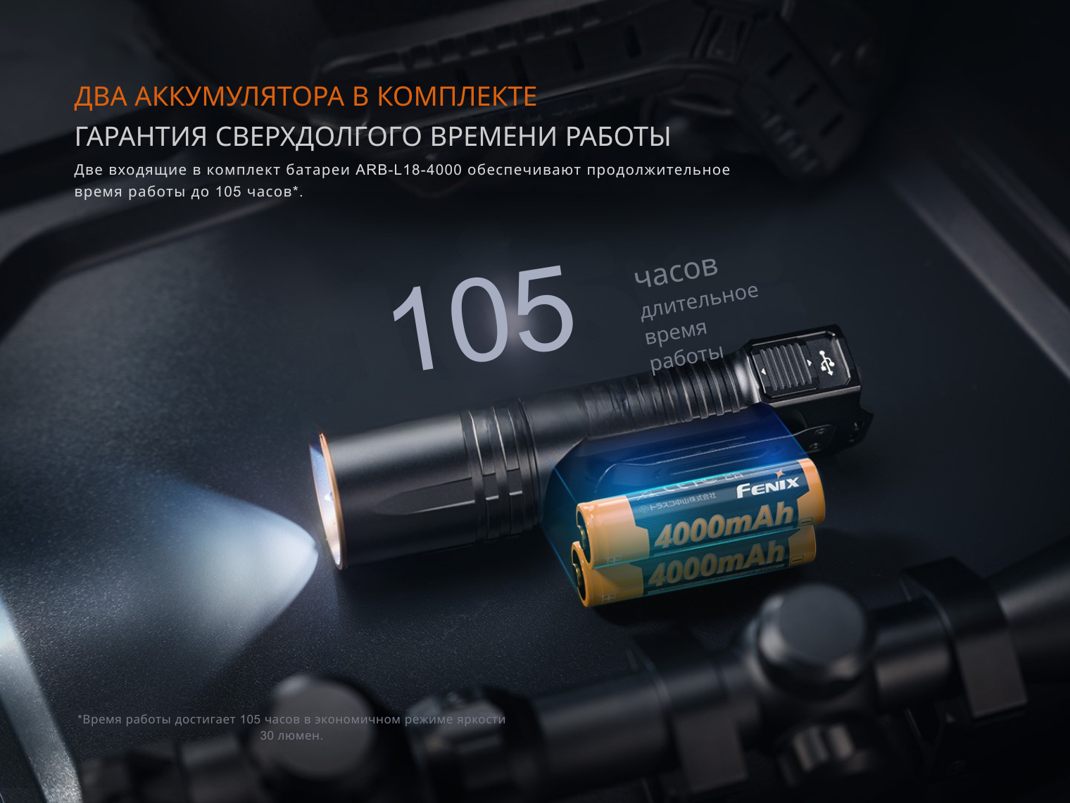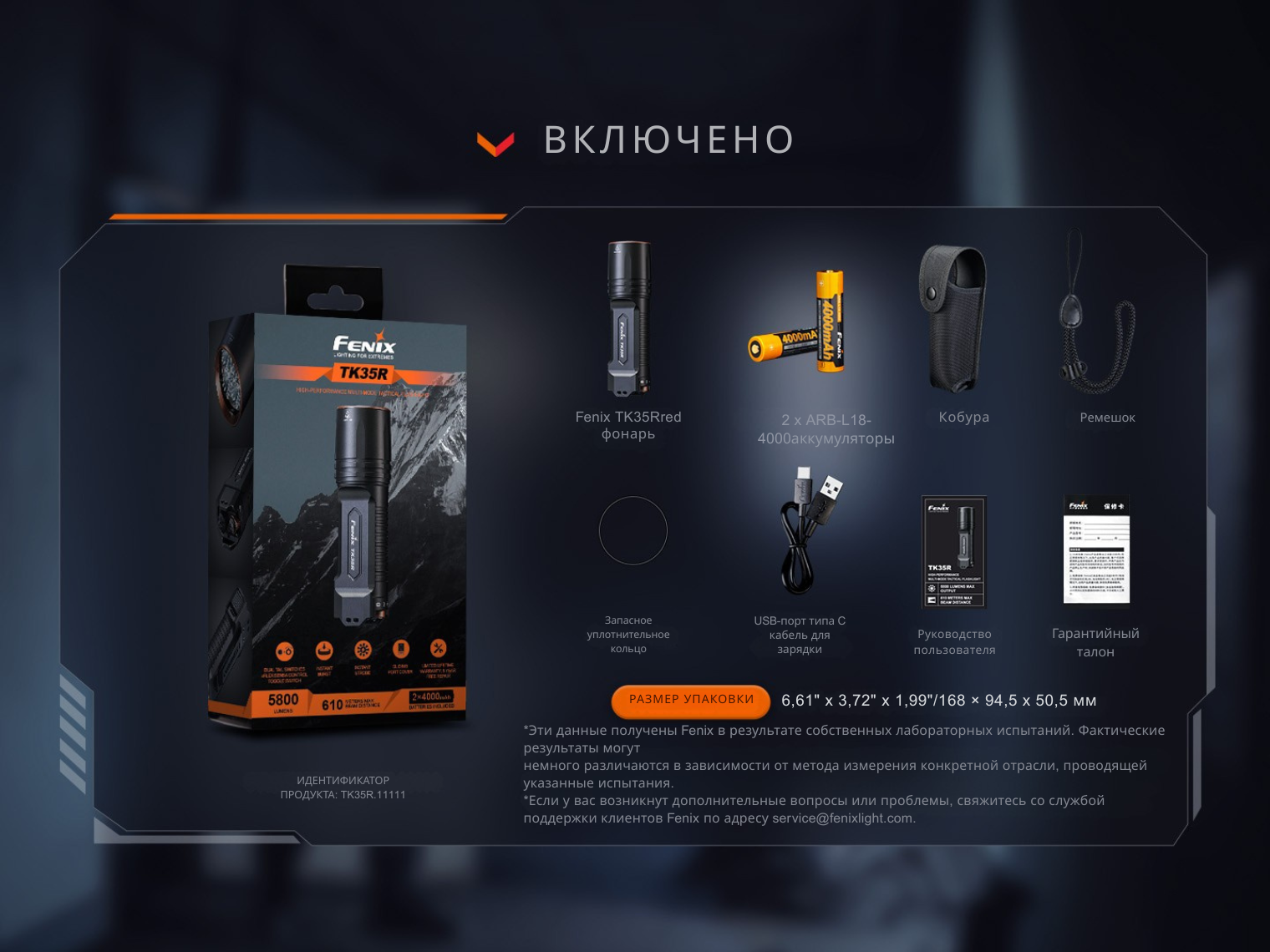 Комплектация | Fenix TK35R, аккумуляторы Fenix ARB-L18-4000 (2 шт), зарядный кабель USB-C, запасное уплотнительное кольцо, темляк, чехол на пояс, руководство пользователя |