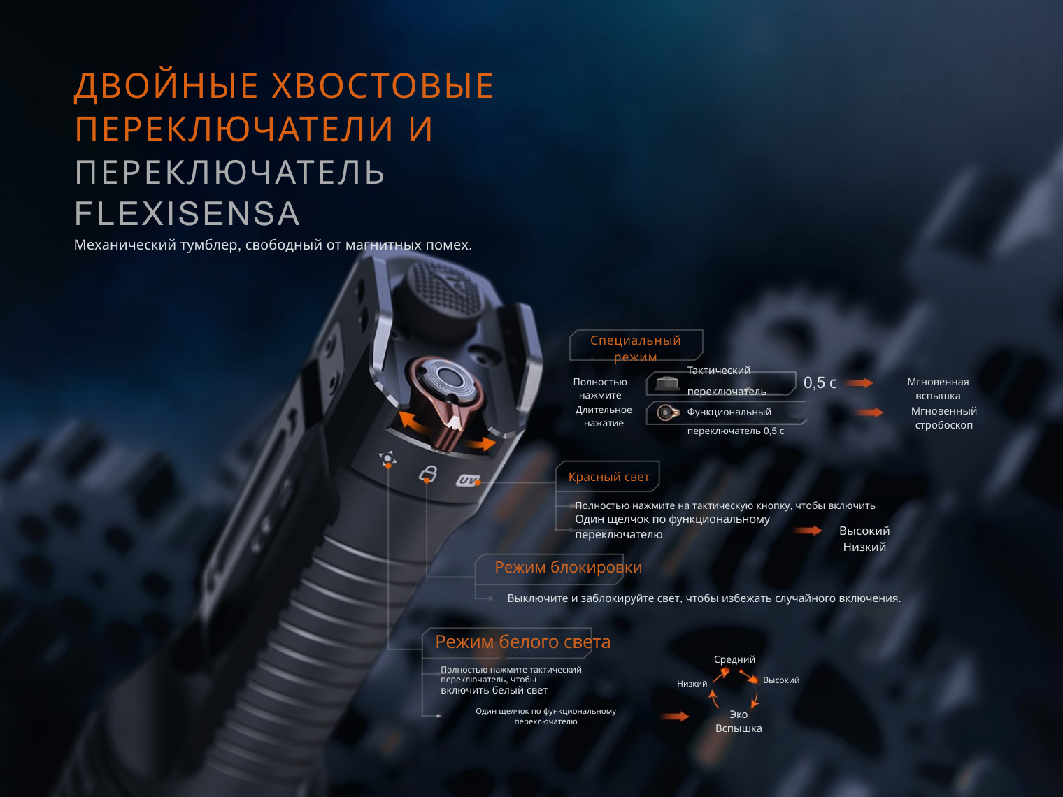 Система управления состоит из вращающегося переключателя FlexiSensa и пары хвостовых кнопок с мгновенным доступом к режиму Вспышки и мигающему стробоскопу.