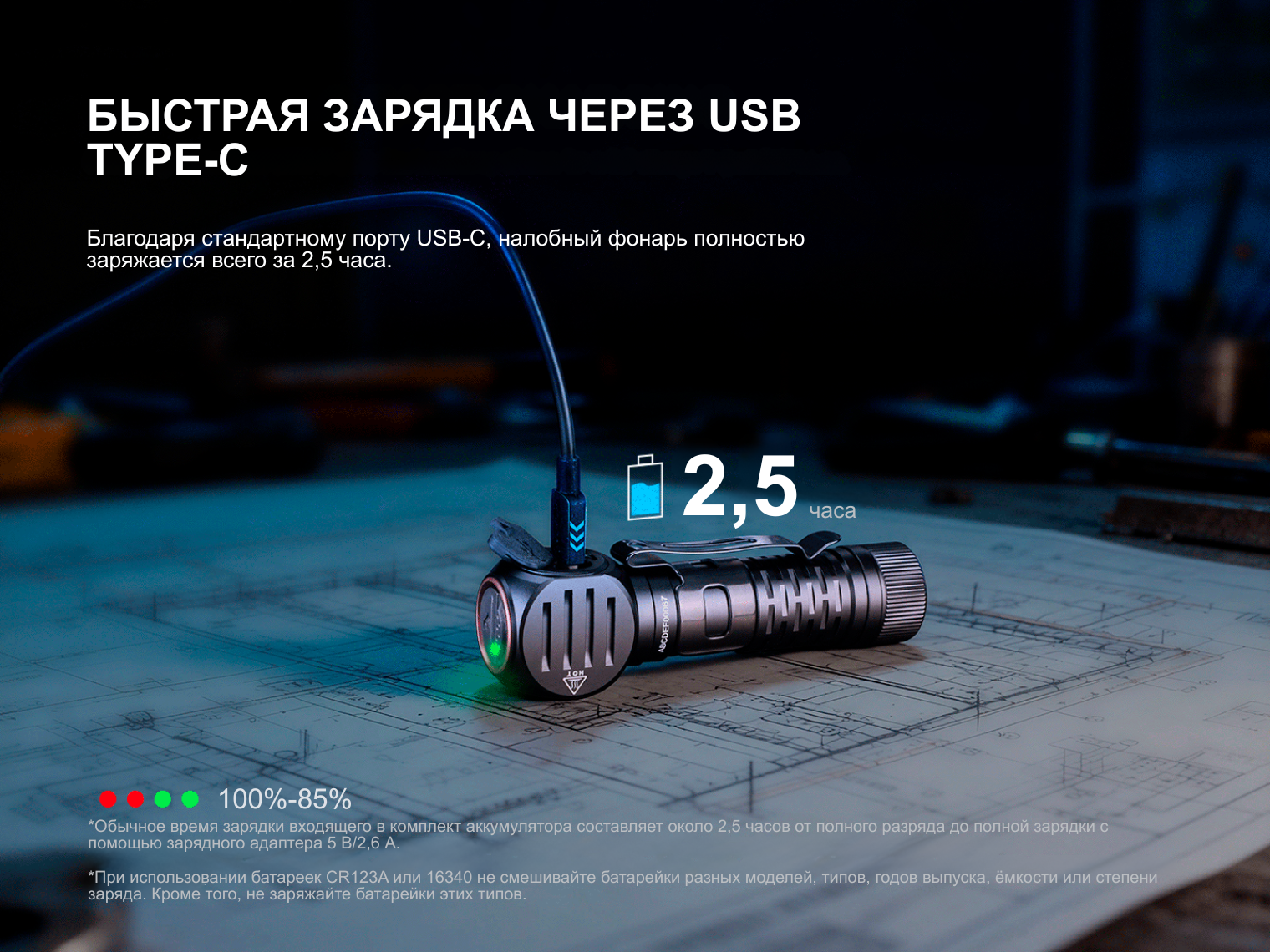 Питание обеспечивает один аккумулятор 18650, а фирменная батарея Fenix ARB-L18-4000 емкостью 4000 mAh уже идет в комплекте. Заряжается фонарь через встроенный порт USB Type-C — это удобно, так как подойдет обычный кабель, и никакие сторонние устройства не нужны.