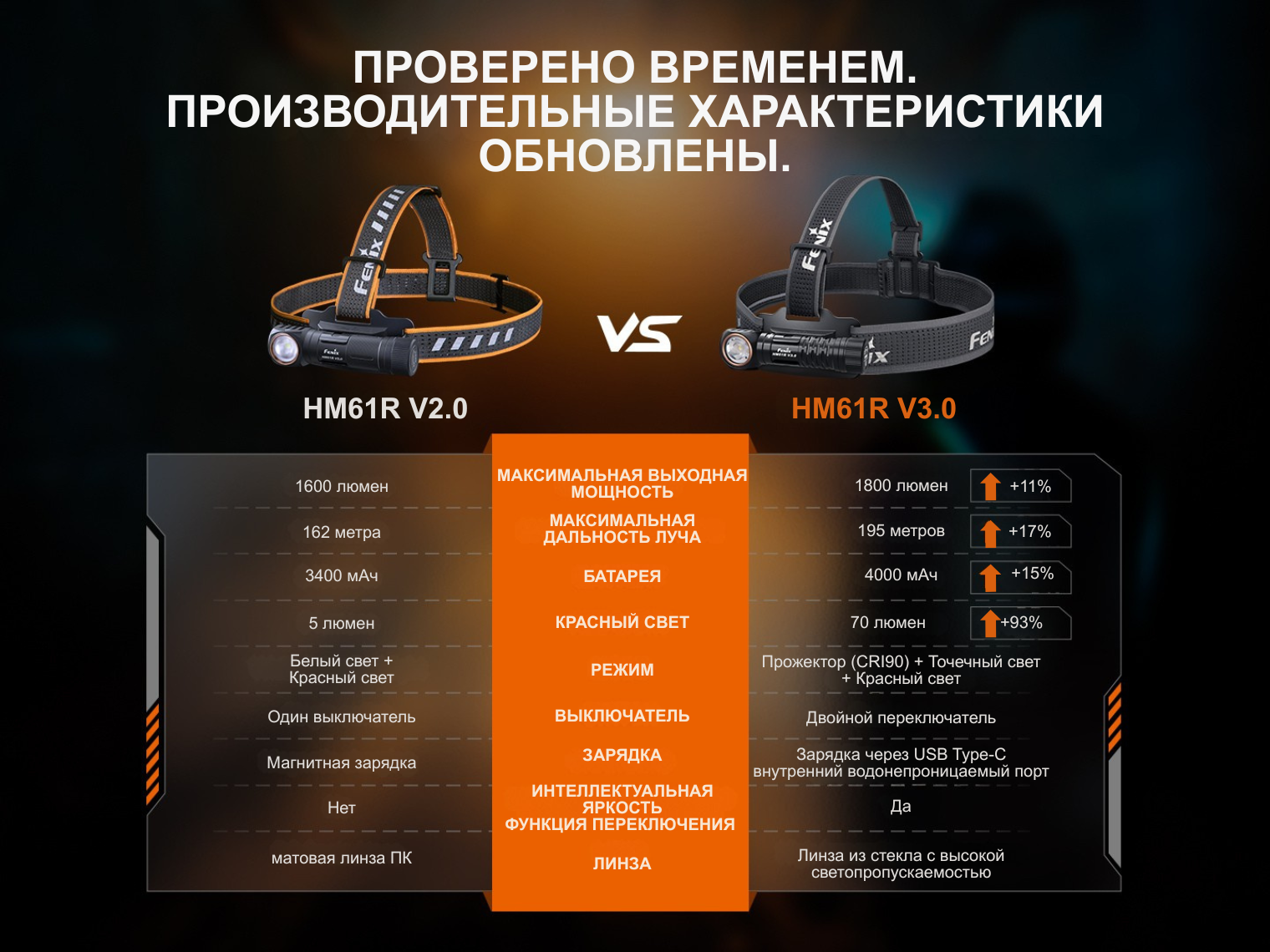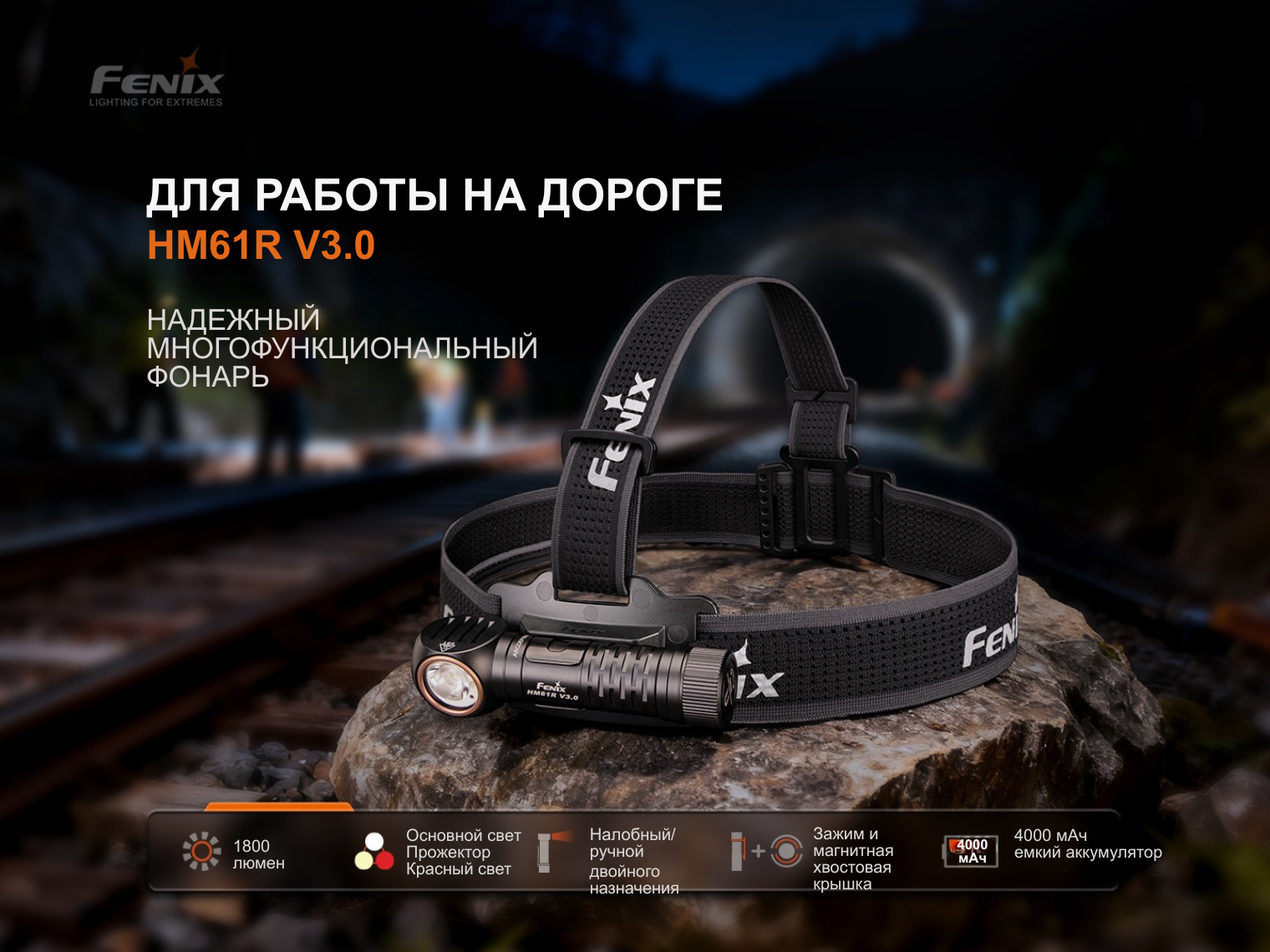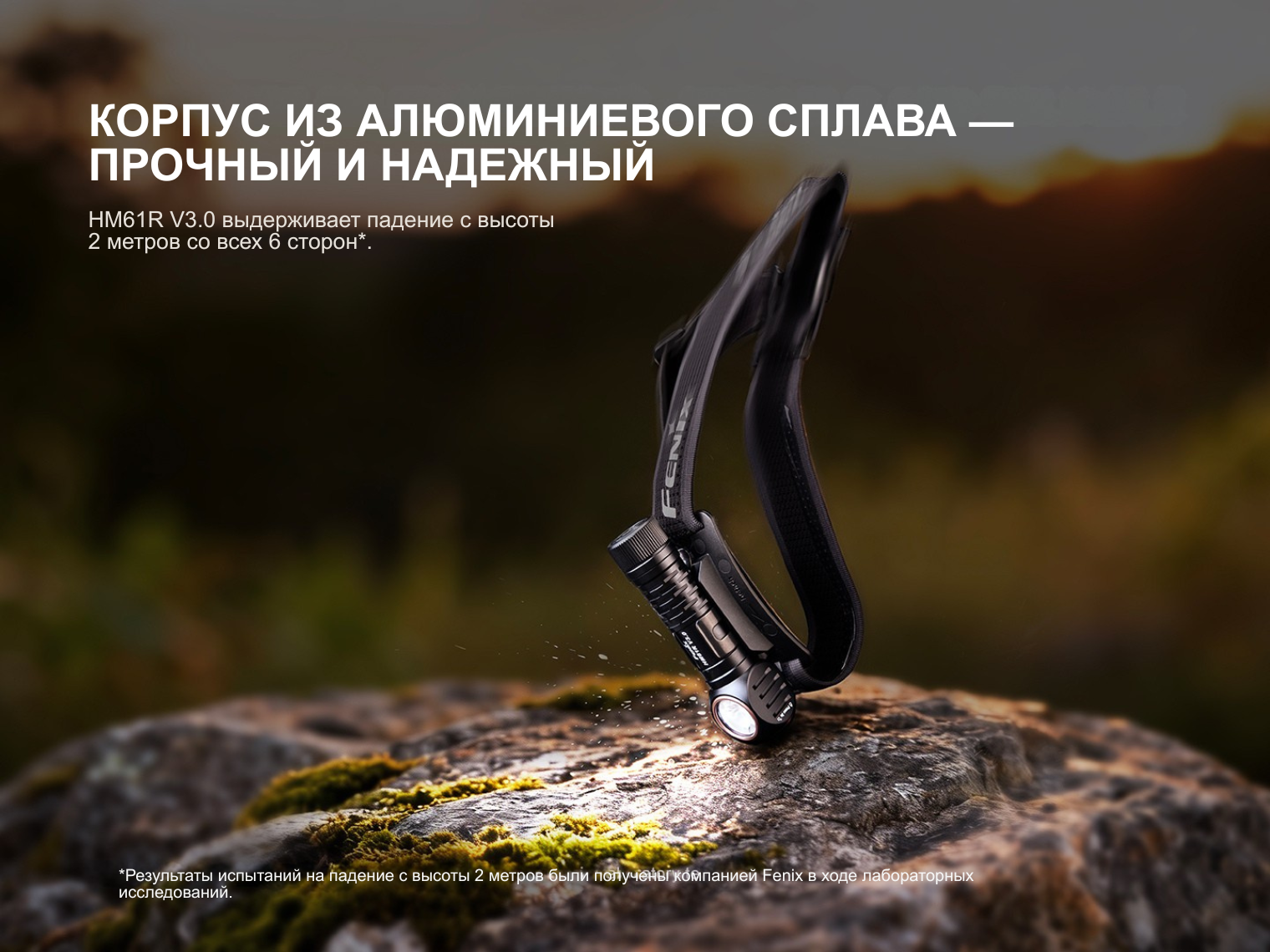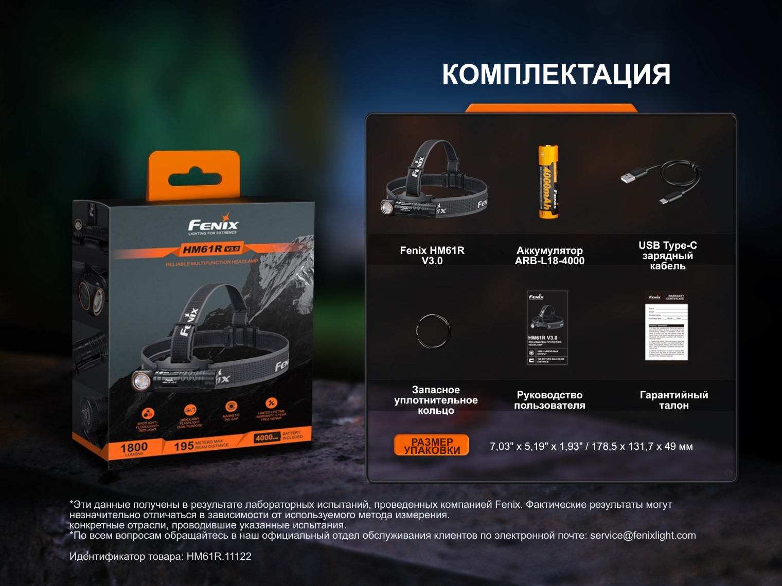 Фонарь Fenix HM61R V3.0, аккумулятор ARB-L18-4000, налобное крепление (холдер и ремешок), зарядный кабель USB Type-C, запасное уплотнительное кольцо, инструкция пользователя, гарантийный талон.