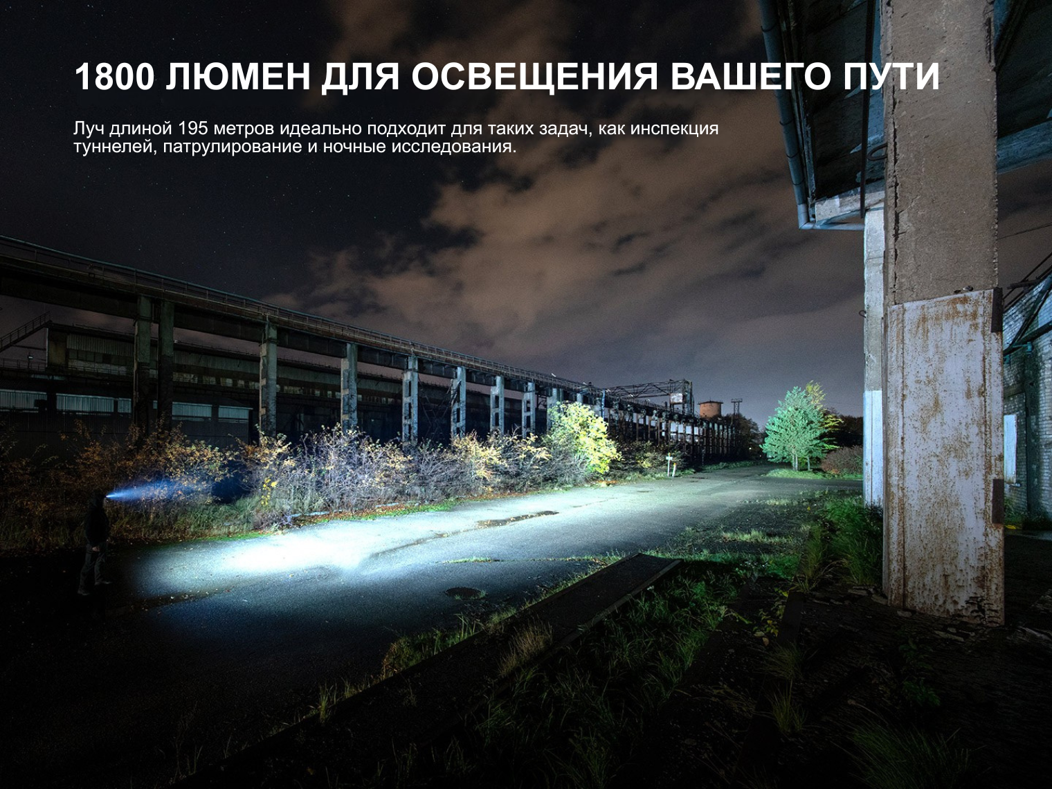 Основной светодиод Luminus SST40-GEN2 выдает холодный белый свет (6500K) и рассчитан на дистанцию до 195 м. Для работы с документами или вблизи добавлен диод OSRAM 1414 CRI90, который дает нейтральный рассеянный свет без искажения цветов. Отдельный красный диод OSRAM 1414 яркостью до 70 люмен позволяет сохранить ночное зрение или работать в режиме сигнального маяка.