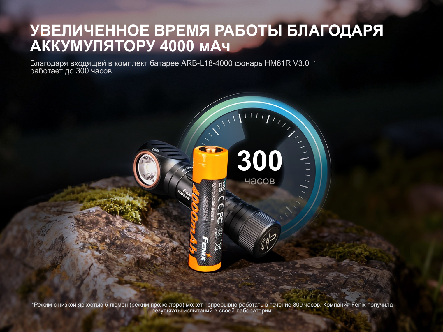 Комплектация | Фонарь Fenix HM61R V3.0, аккумулятор ARB-L18-4000, налобное крепление (холдер и ремешок), зарядный кабель USB Type-C, запасное уплотнительное кольцо, инструкция |