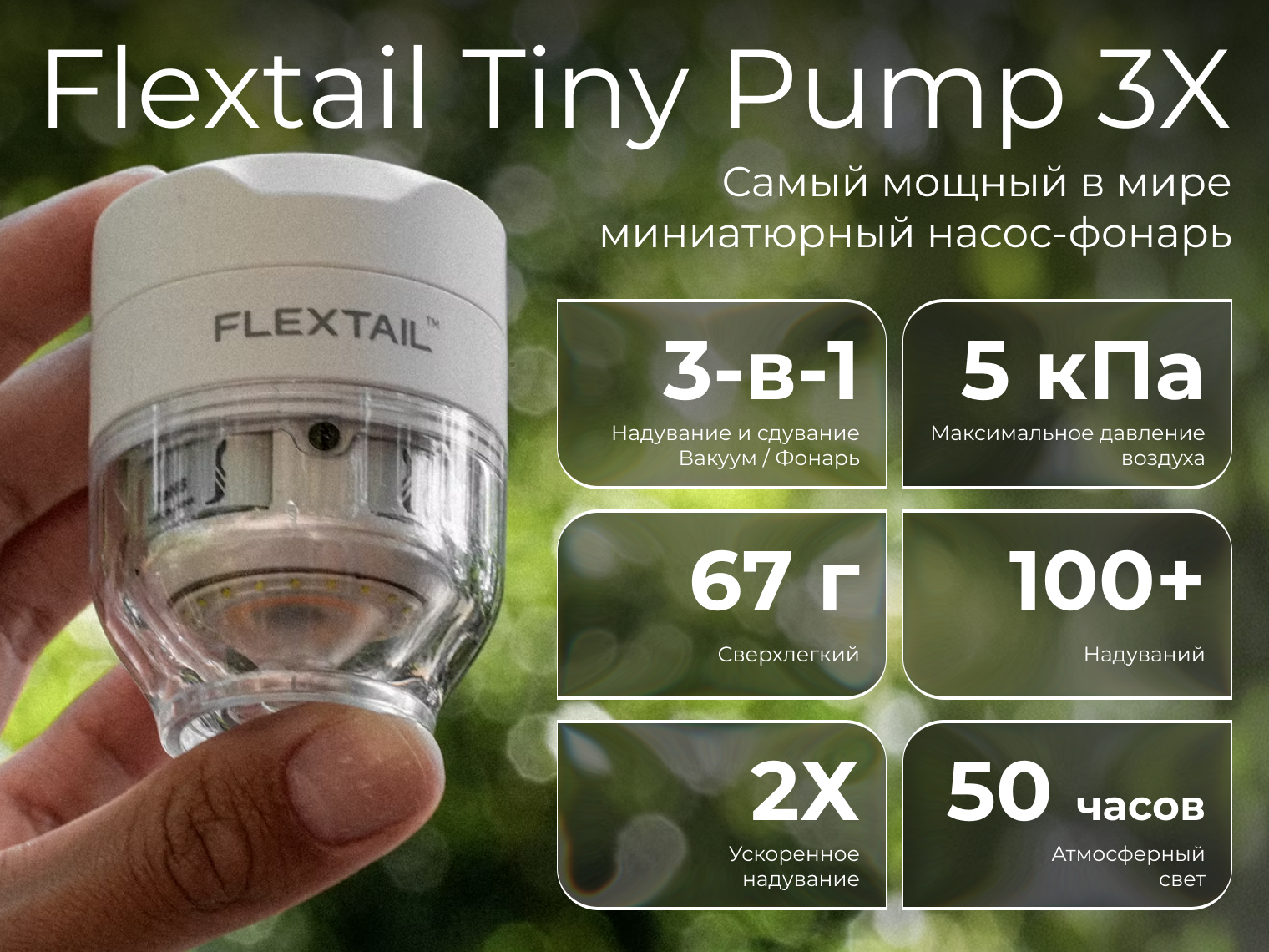 Комплектация | Flextail Tiny Pump 3X, набор из 5 универсальных насадок (совместимы с 90% брендов спальных ковриков), кабель для зарядки USB Type-C, инструкция |