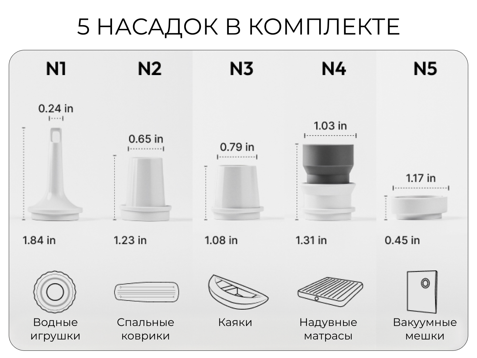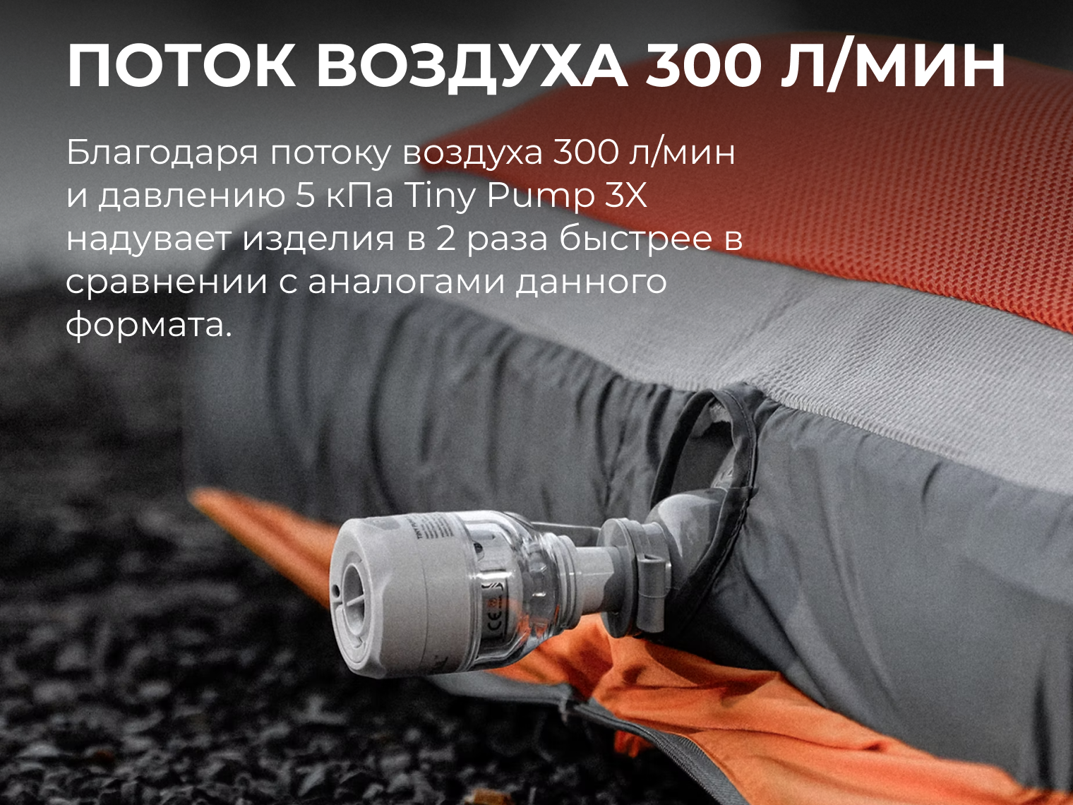 Насос Tiny Pump 3X, набор из 5 универсальных насадок (совместимы с 90% брендов спальных ковриков), кабель для зарядки USB Type-C, инструкция пользователя.
