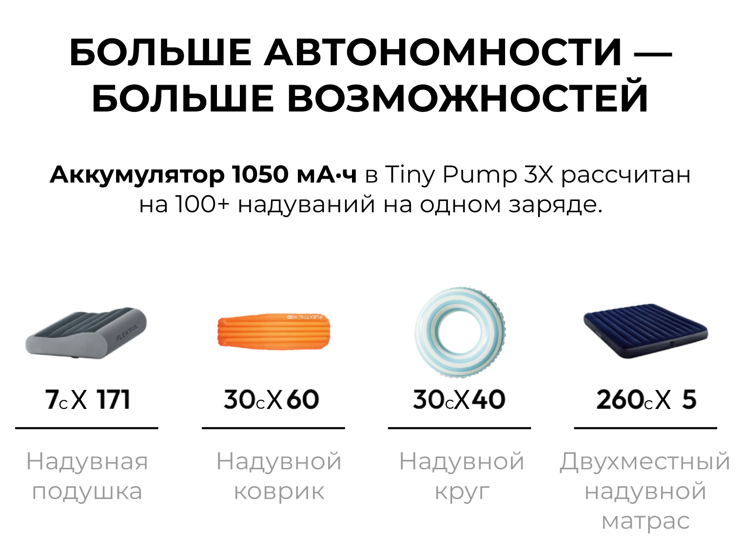Tiny Pump 3X работает на трех Li-ion элементах питания из чистого кобальта, которые обладают самой высокой плотностью энергии. Одного полного заряда хватает, чтобы надуть 11 односпальных или 4 двуспальных матраса. Устройство также обеспечивает более 100 накачиваний небольших изделий (например, надувных подушек). Выдерживает до 20 мин непрерывной работы.