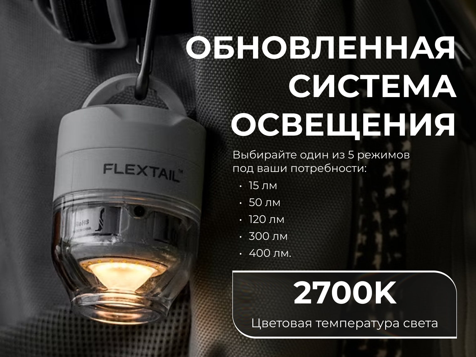 Встроенный фонарь излучает теплый мягкий свет с цветовой температурой 2700K, что создает уютную атмосферу в палатке или помещении. 5 режимов работы удовлетворяют любые потребности — от ночной подсветки до яркого заливающего света: