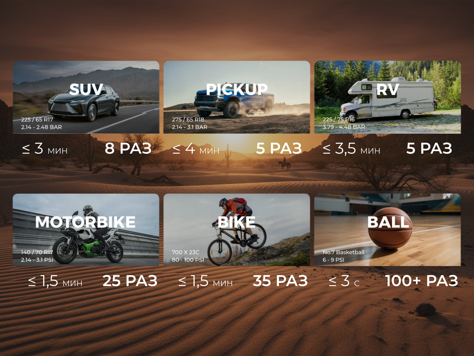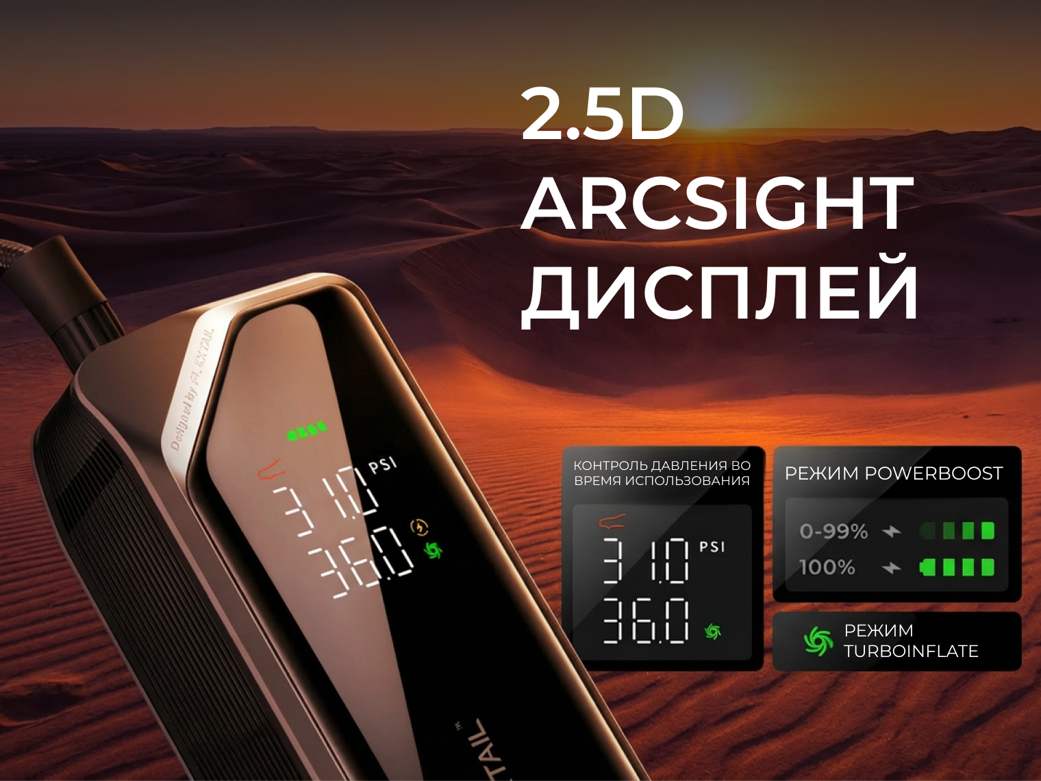 Устройство базируется на энергосистеме из трех Li-ion элементов (22.2 Вт·ч), что обеспечивает до 28 мин непрерывной накачки. Благодаря усовершенствованному внутреннему механизму скорость подачи воздуха в 3 раза выше, чем у стандартных портативных насосов, что позволяет подкачать автомобильную шину менее чем за 2 мин.