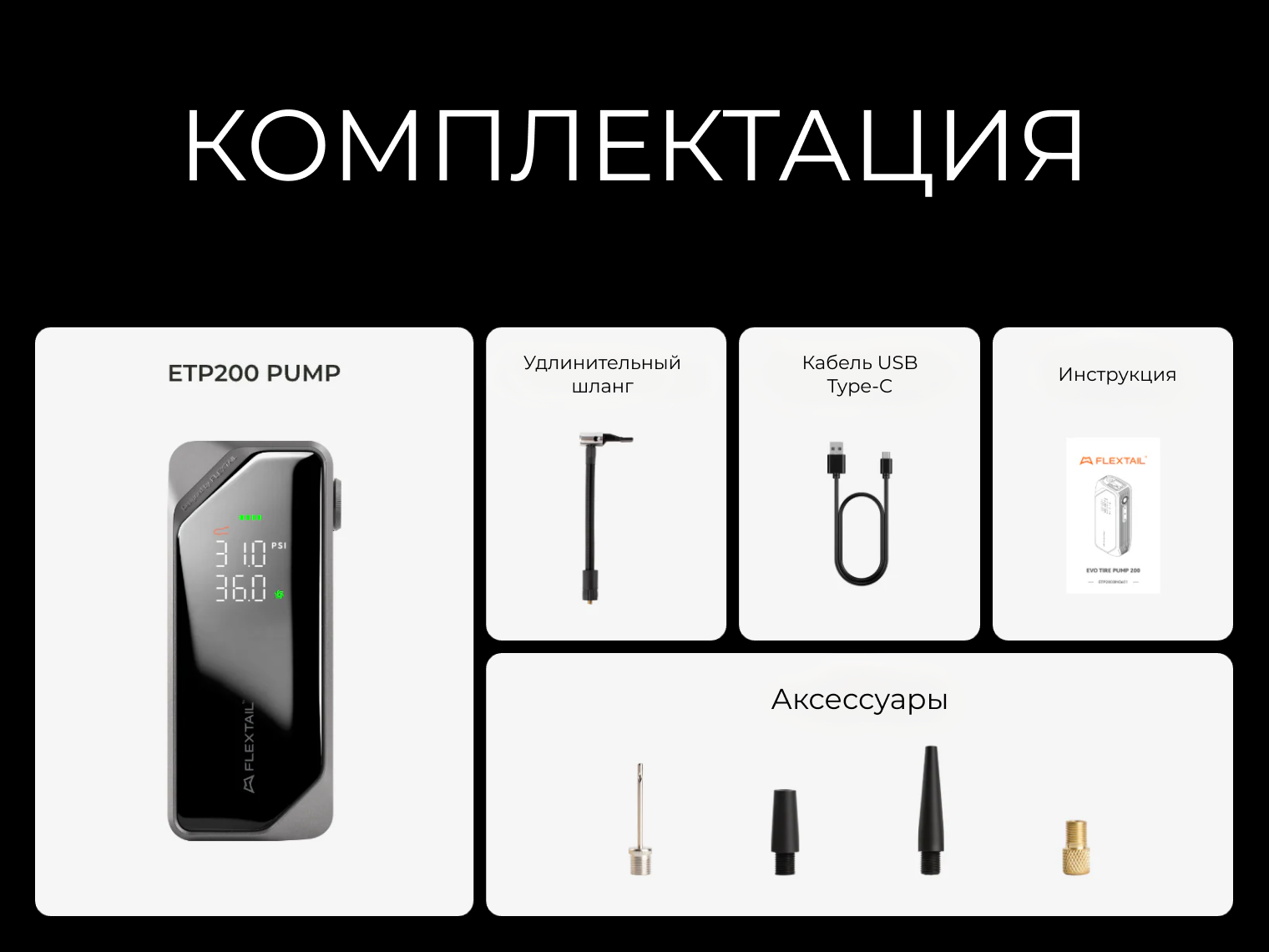 Комплектация | Насос ETP200, удлинительный воздушный шланг, набор универсальных насадок-переходников, кабель USB Type-C, инструкция |