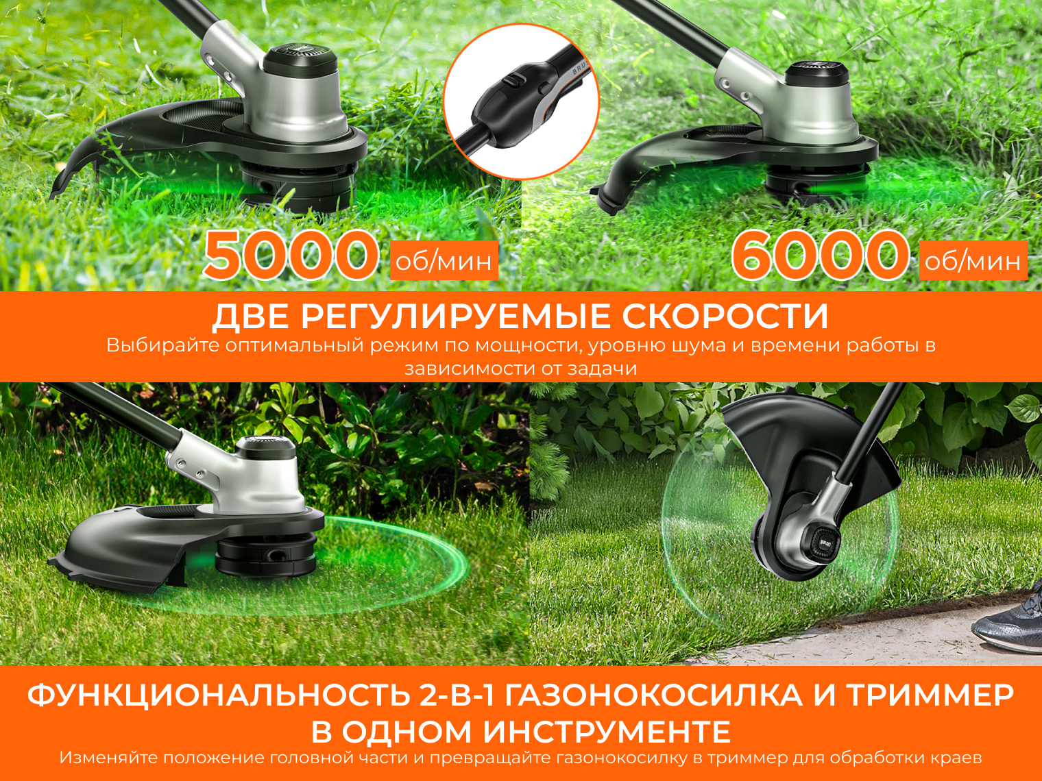 При весе всего 3 кг устройство очень легкое в управлении. Вы можете выбирать одну из двух скоростей: экономную для обычной травы или максимальную для жестких сорняков.