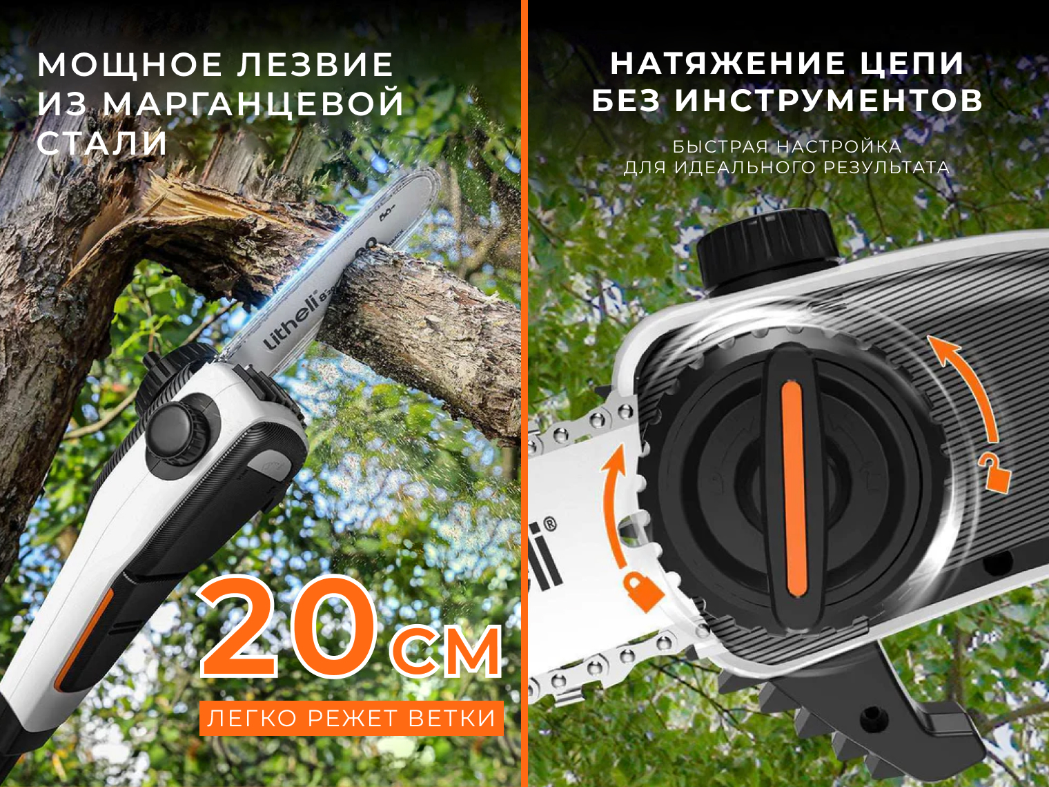 Высоторез Litheli разработан для комфортного ухода за высокими деревьями, где приоритетом является безопасность и точность движений. Телескопическая штанга помогает формировать крону и удалять лишние ветки, сохраняя полную устойчивость и визуальный контроль над рабочей зоной прямо с земли.