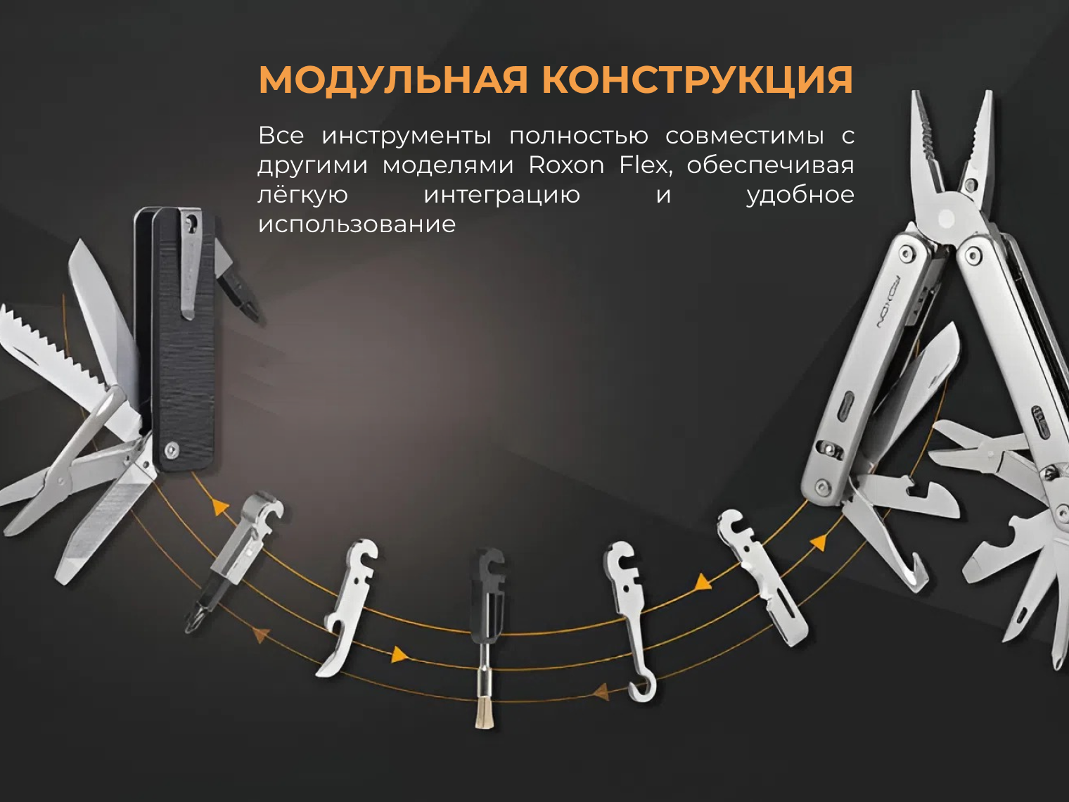 Мультитул полностью совместим с экосистемой Roxon FLEX (кроме встроенного 1/4″ битодержателя). Он поставляется с предустановленными 6 базовыми инструментами, 2 бонусными дополнениями, а также фиксированным магнитным битодержателем 1/4″ с битой PH.