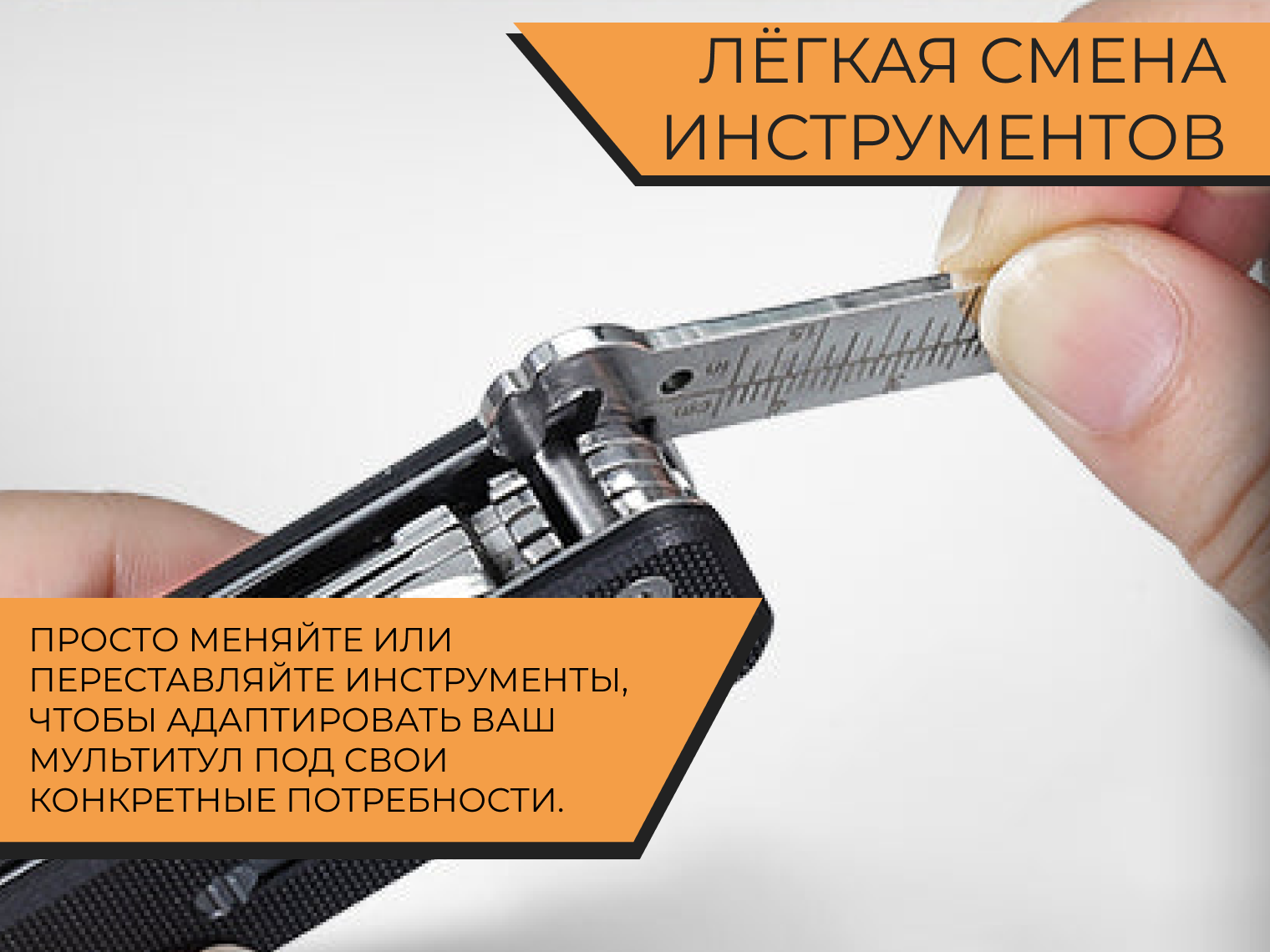 Инструменты | Крестовая отвертка, Зубочистка + пинцет, Ножницы, Открывалка для бутылок и консервных банок, Канцелярский нож, Обычный нож с прямой заточкой, Напильник + линейка + плоская отвертка, Зажим для крепления на ремне или кармане |