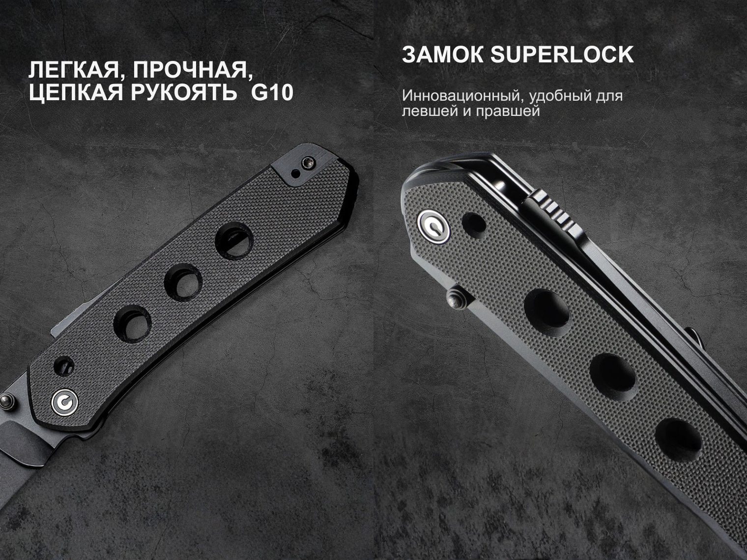 В качестве замка используется механизм Superlock, разработанный брендом в сотрудничестве с дизайнером Snecx Tan. Стальной запирающий стержень при легком давлении разблокирует клинок и позволяет мгновенно прятать его в рукоять. Конструкция симметрична и удобна для правшей и левшей.