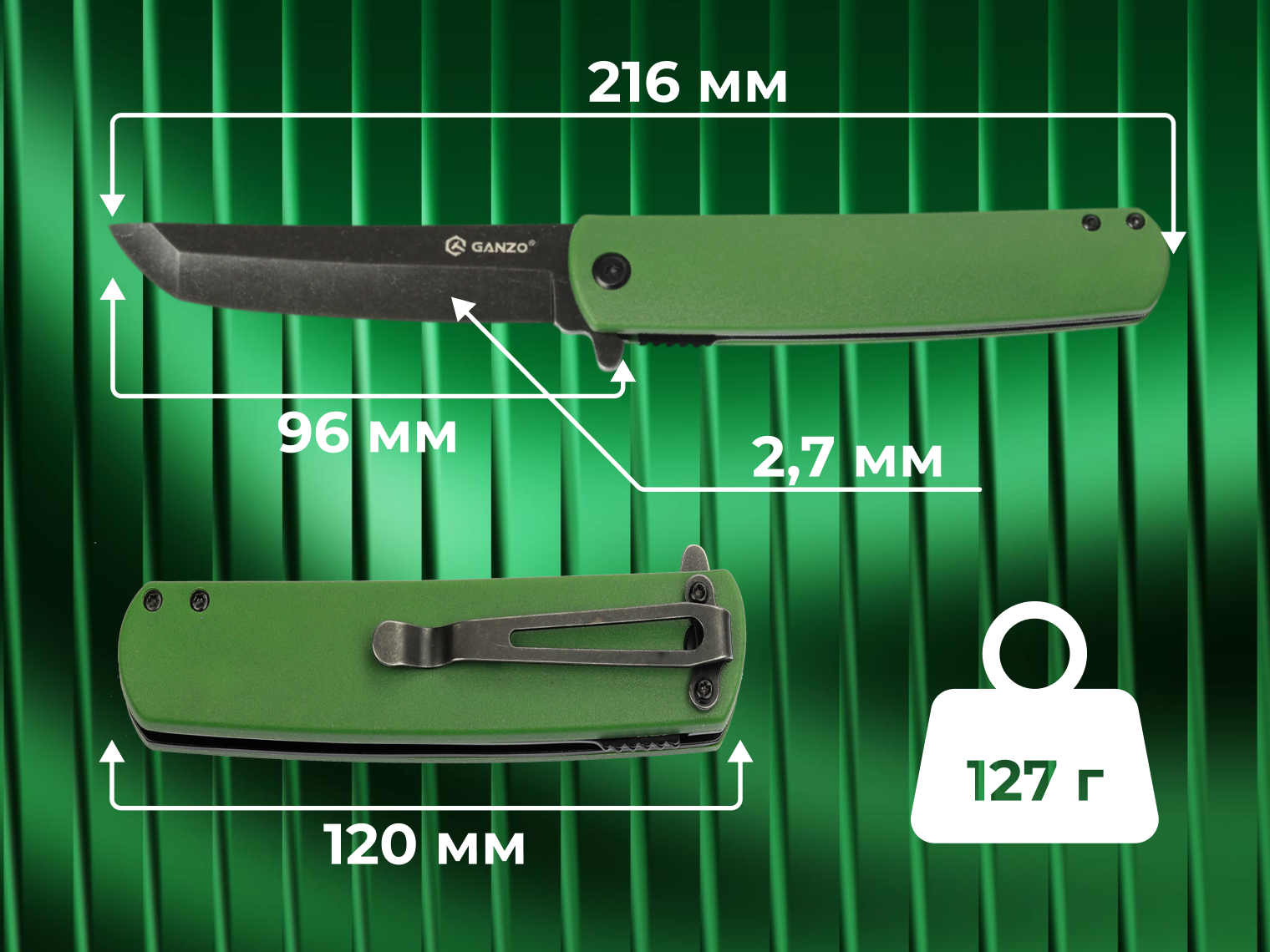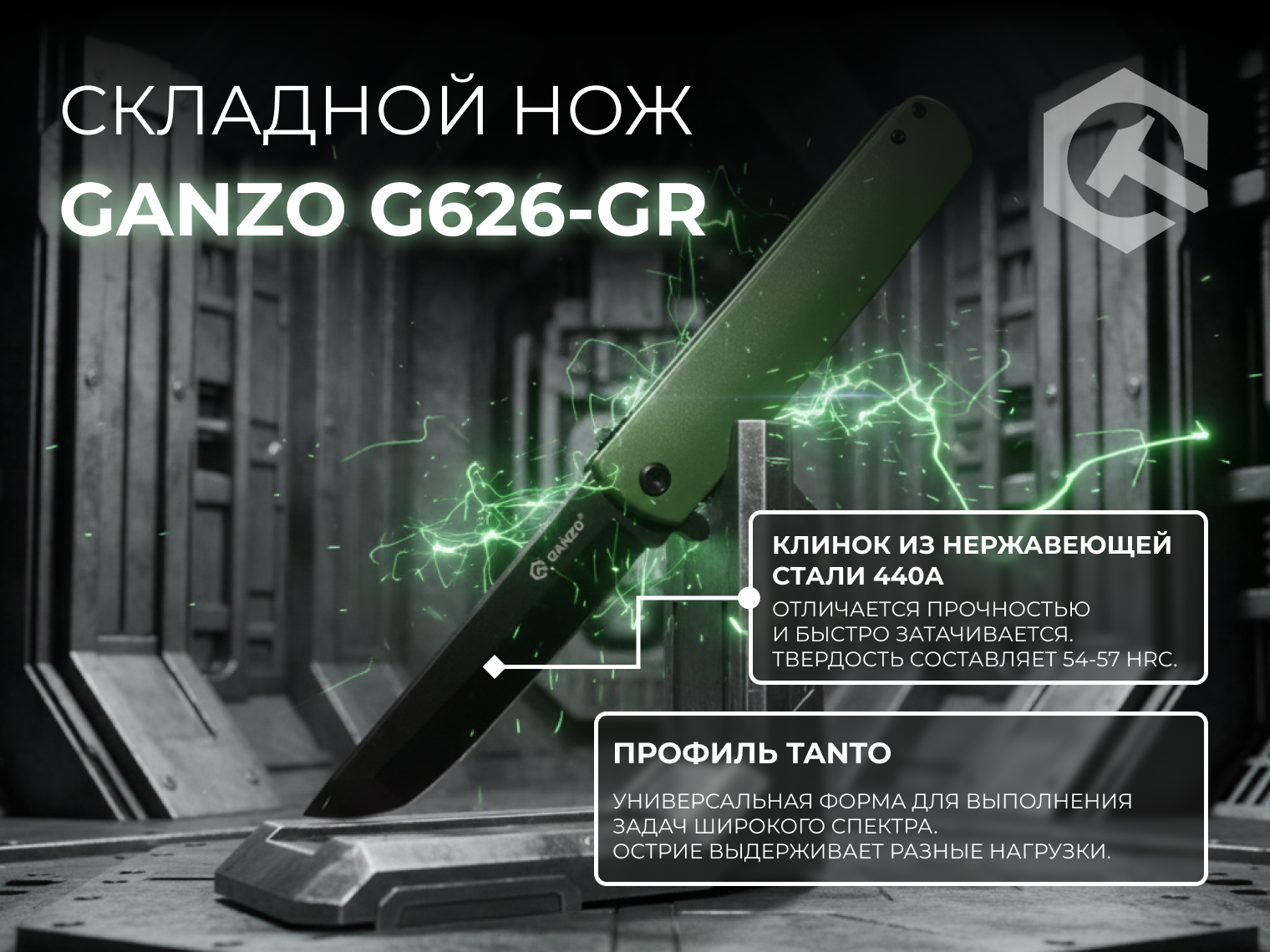 Модель Ganzo G626-GR ориентирована на ежедневное использование в городе и выезды на природу. Главная особенность ножа — клинок Tanto длиной 96 мм с двумя режущими кромками, сходящимися под углом. Толстое острие выдерживает сильные нагрузки, поэтому кончик не сломается даже при пробивании пластика или толстого картона.