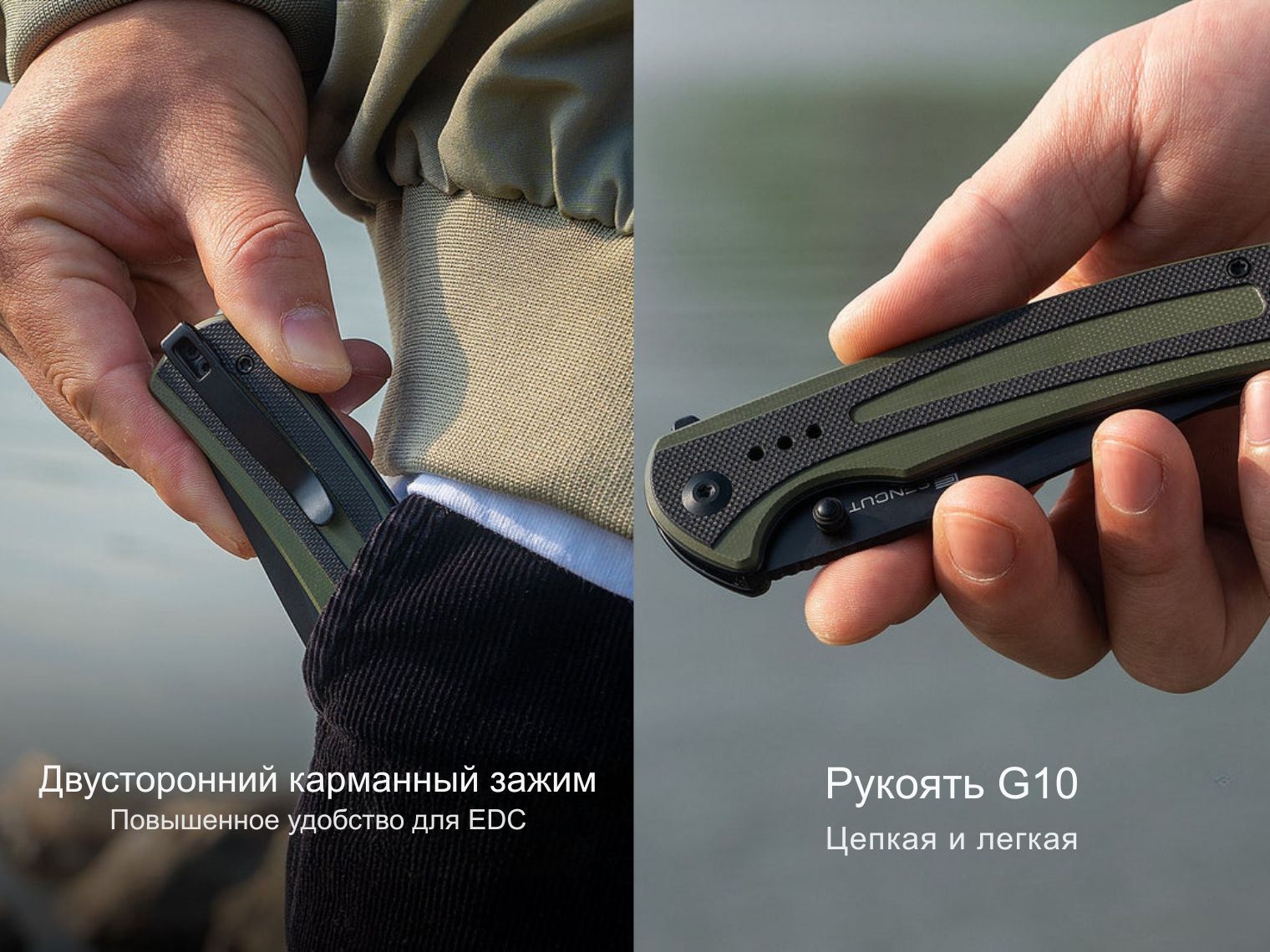 Нож открывается двумя способами. Вы можете легко нажать на плавник флиппера или вывести клинок до фиксации давлением на стальной шпенек, расположенный по обе стороны клинка для взаимодействия правой или левой рукой. Упор на 3-миллиметровом обухе под большой палец позволяет быстро перейти к силовому хвату и улучшить контроль над движением клинка.