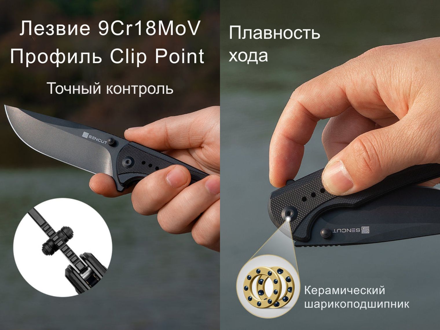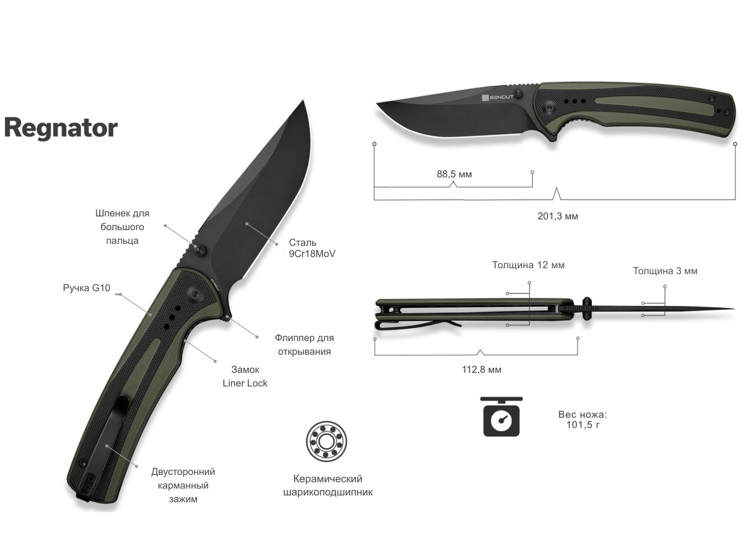 Sencut Regnator — универсальный карманный нож, который одинаково эффективно подходит на роль EDC-модели и инструмента для полевых условий. Геометрия клинка Clip Point с прямой режущей кромкой 88.5 мм в длину имеет слегка заостренный кончик, расширяя диапазон возможных задач для выполнения — от ровного реза до точечных и аккуратных проколов.