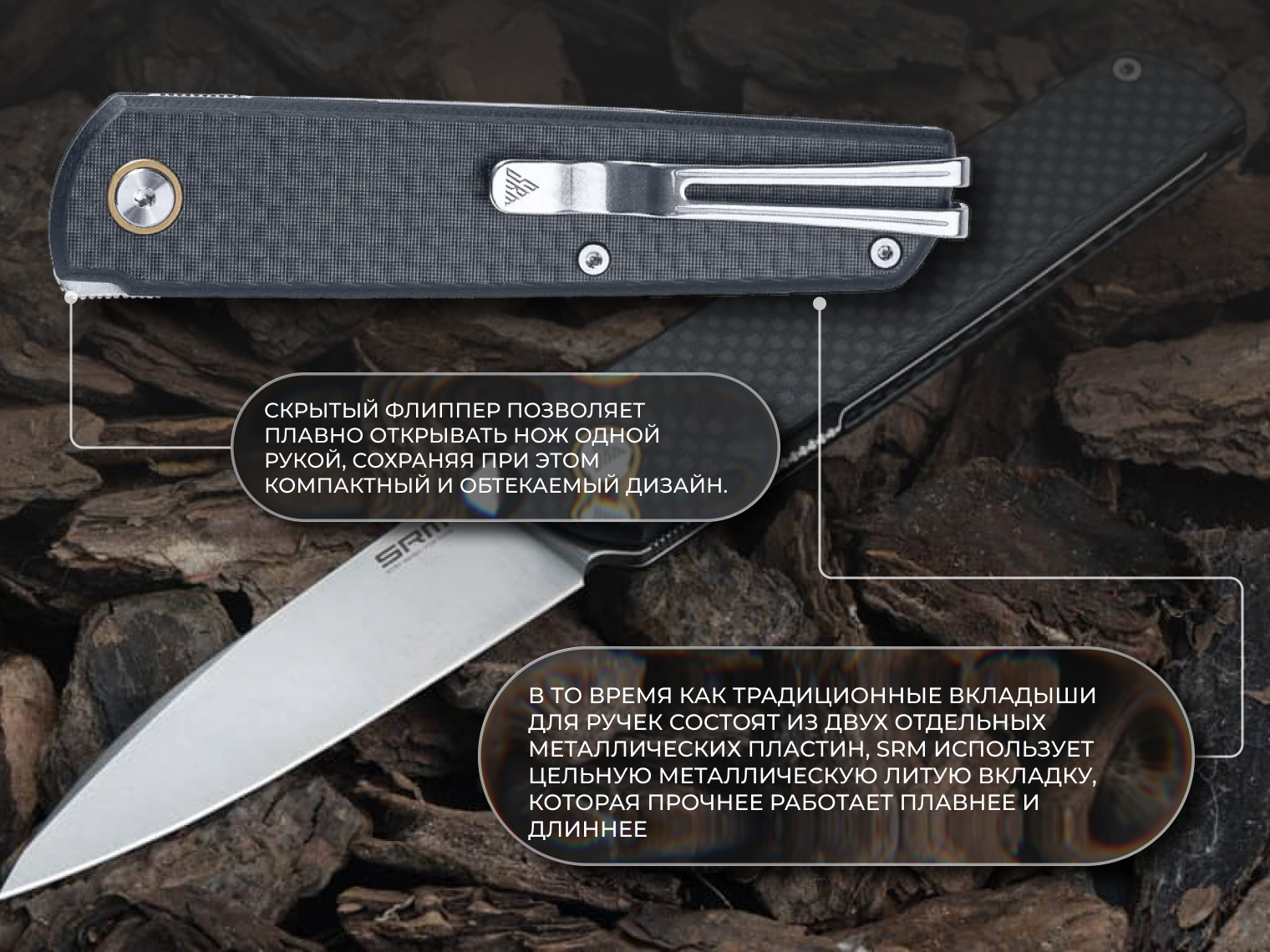 Визуально нож 408L-KB от SRM имеет строгое и аккуратное оформление: тонкий профиль и чистые линии с акцентными плашками делают посадку на кармане простой и удобной. Для фиксации предусмотрена фирменная клипса Ambi Clip из нержавеющей стали — ее можно устанавливать на любую сторону рукояти без использования дополнительных инструментов.