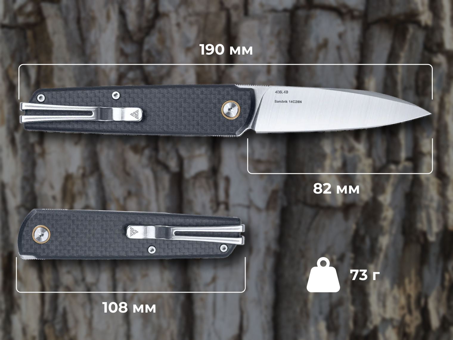 Модель достигает 190 мм при открытии, из них 82 мм — клинок толщиной 3.1 мм. Вес составляет всего 73 г, поэтому конструкция практически не ощущается во время ношения и не утомляет руку при долгой эксплуатации.