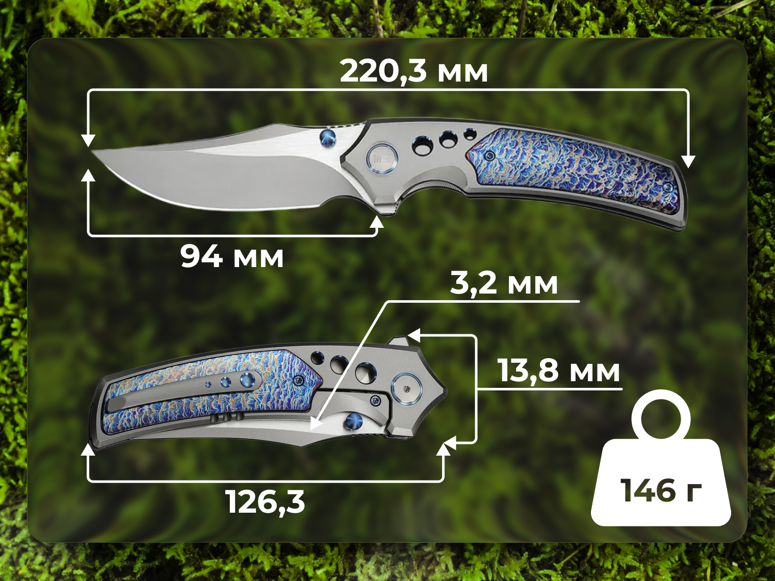 Полная длина ножа в открытом состоянии — 220,3 мм. Вся фурнитура, в частности винты, клипса, шпенек и бэкспейсер, также изготовлена из титана. Голубые акценты на клипсе гармонируют с цветом рукояти, подчеркивая премиальный статус модели. При весе в 146 г нож ощущается монолитным и надежным инструментом.